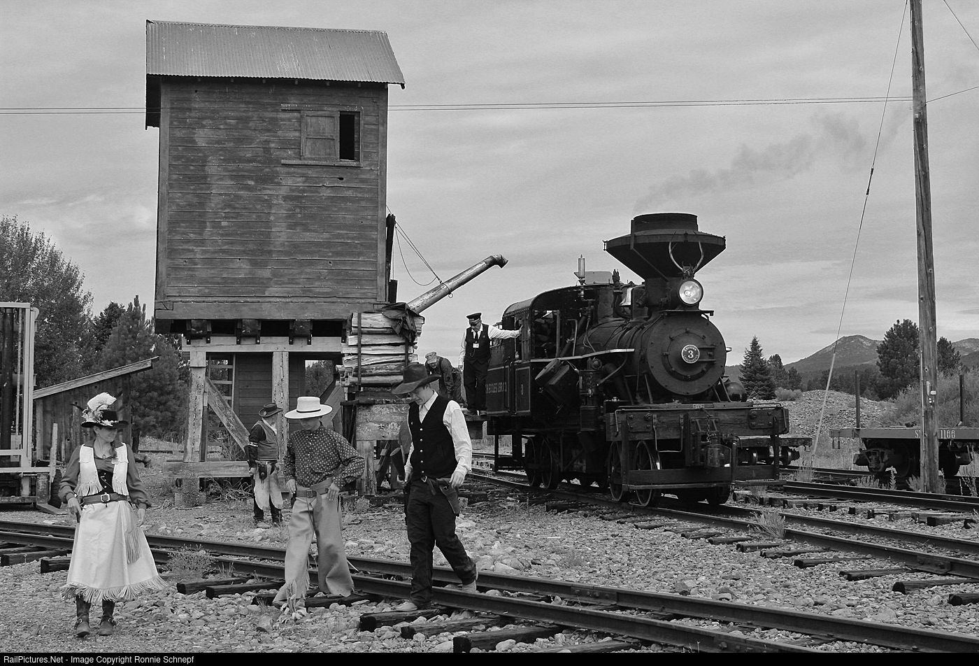 The engine crew loads up on fuel in the form of logs, while the local authorities are on the lookout for any would-be train robbers.