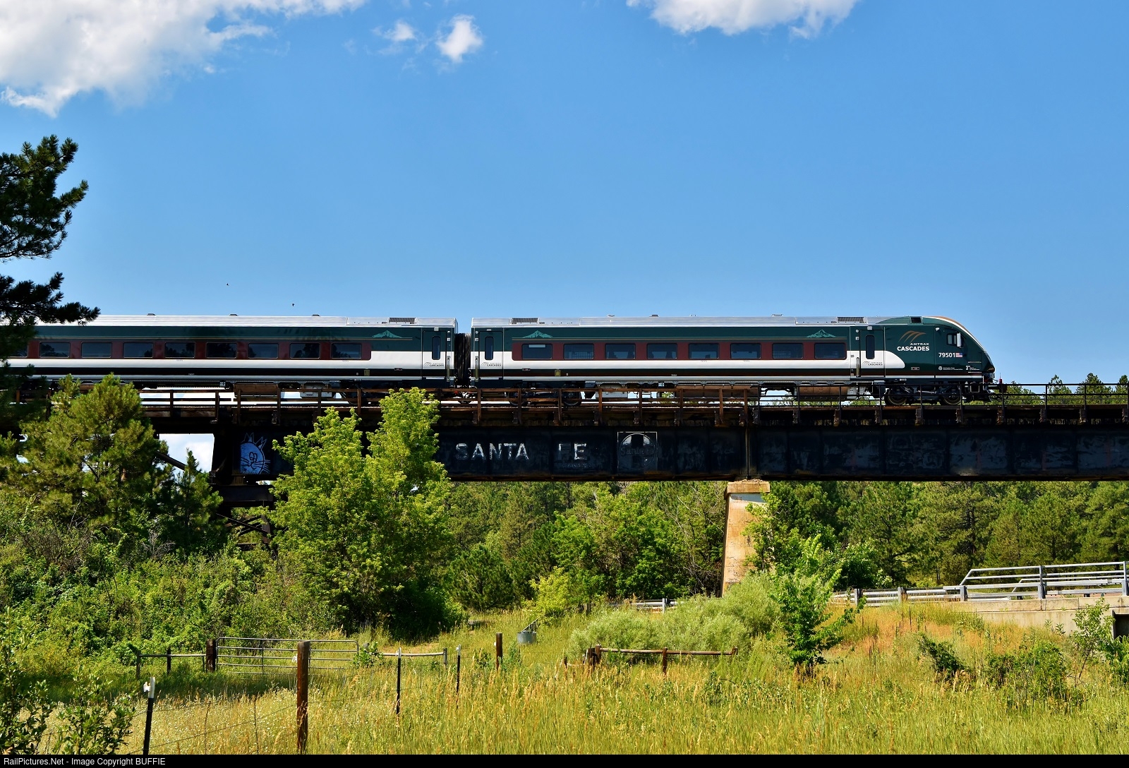 | AMTK 79501 (ALC-42) is part of the new Siemens Airo Cascades train being sent from Denver, Colorado to Pueblo for trial tests. Here the train passes over the Santa Fe Bridge in Larkspur, Colorado as it heads south on the Joint Line.