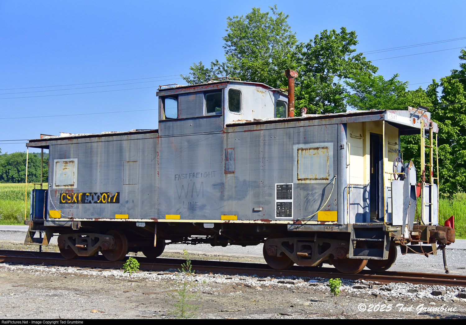CSXT 900077, a former N&W class C-31 caboose (NW 518500), which was based in Hagerstown just a couple of years ago, and used to protect the extensive reverse move required of the “Letterkenny Local” (CSX L152), is now based at Hancock, and used as a shoving platform when servicing the U.S. Silica plant on the Berkeley Springs Industrial Track.