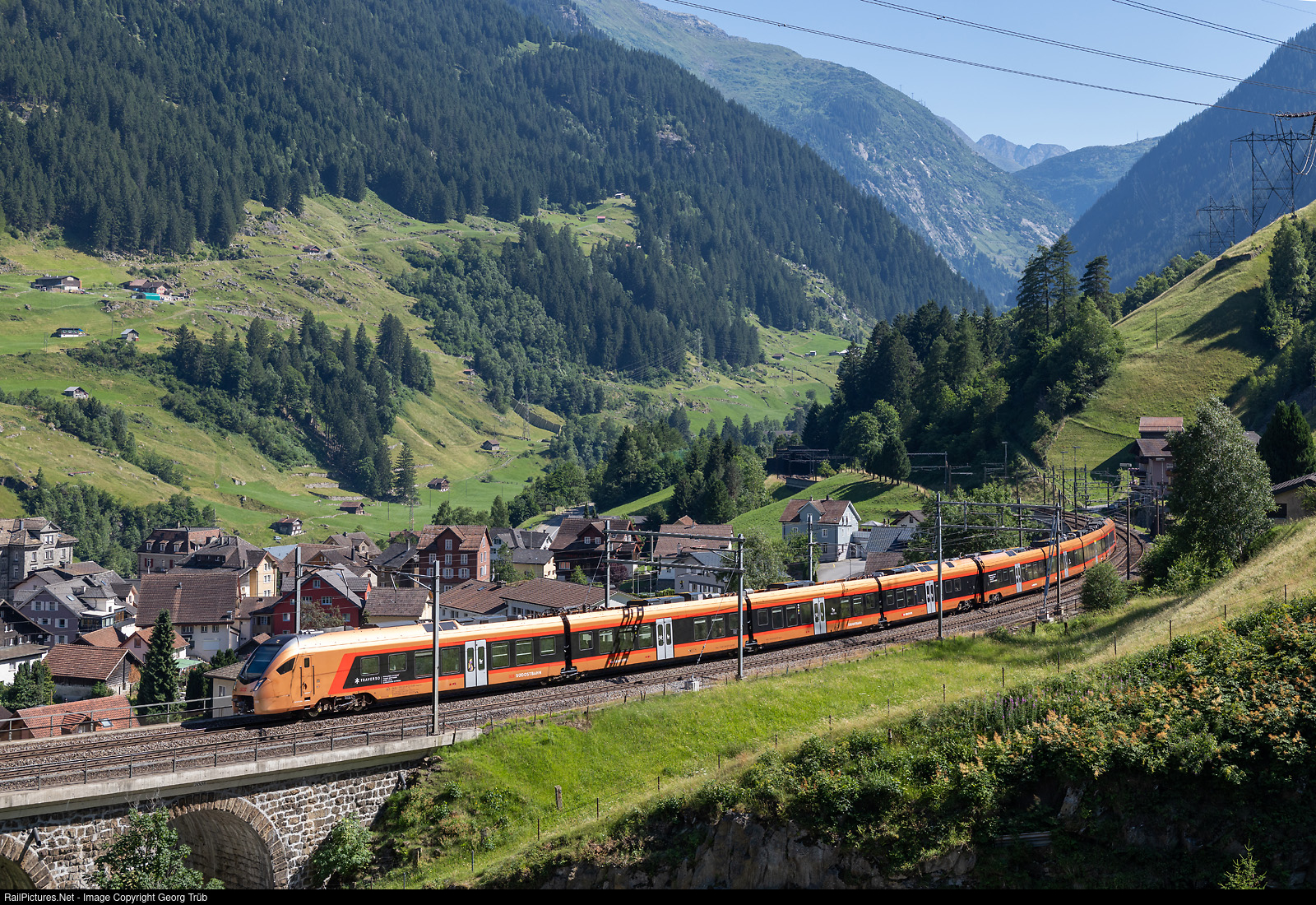| "Traverso" RABe 526 # 125/225 of the Südostbahn is running as train IR 2327 of the line IR26 TRENO GOTTARDO from Basel via Lucerne to Locarno over the middle Meienreuss bridge at Wassen. The train circulates on the right instead of the left track as usual. |