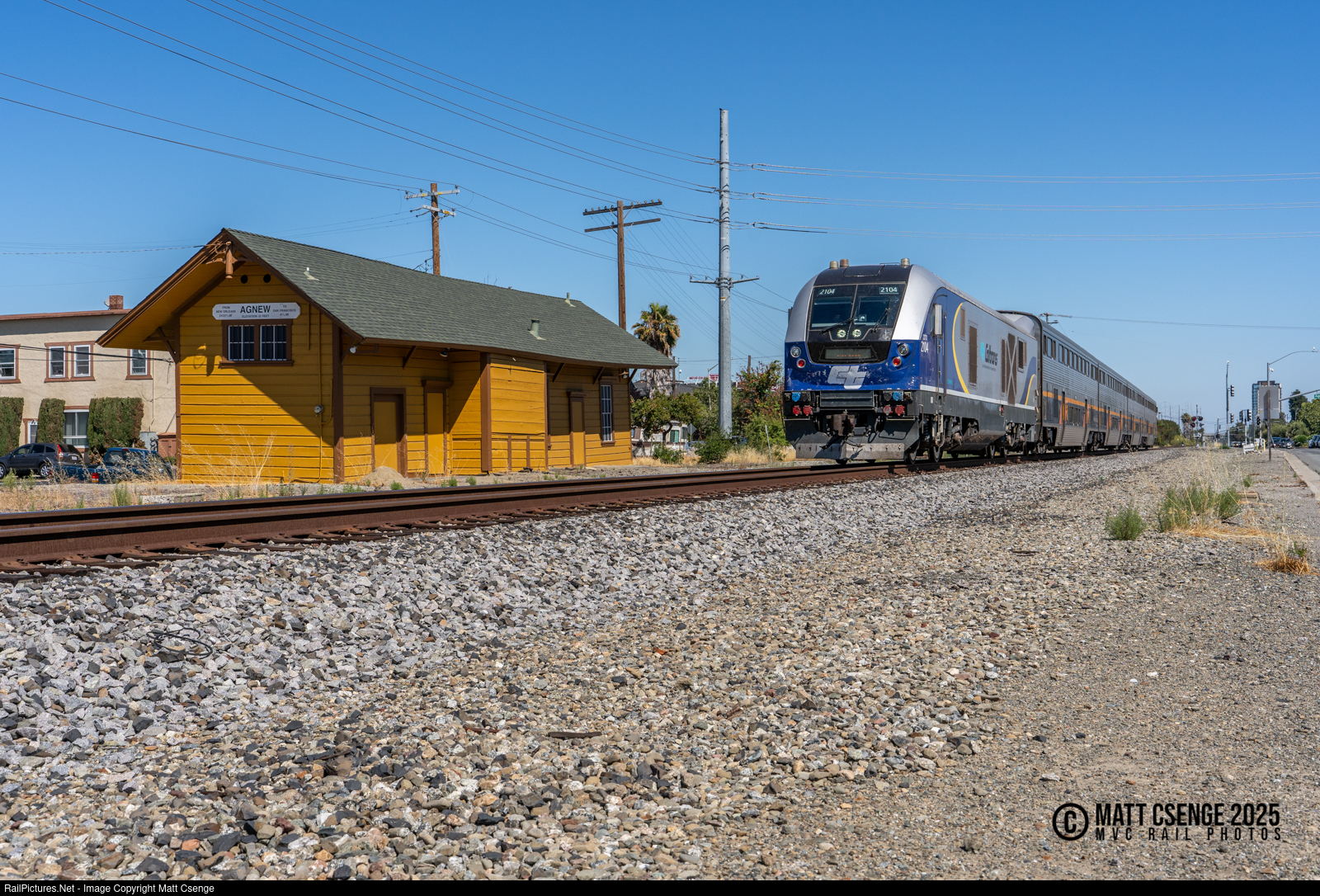 Amtrak California SC-44 (Siemens Charger) no. 2104 is seen leading Capitol Corridor train 529 through San Jose, passing the former Agnew station building. The structure was built in 1877 by the South Pacific Coast Railroad, a 3' narrow gauge railroad operating between Santa Cruz and Alameda, eventually coming under Southern Pacific ownership. Freight and passenger service to the station had ceased by 1963, at which point it was purchased by the California Central Model Railroad Club, which it still houses today.