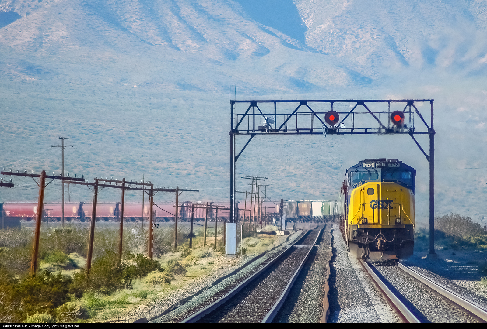 With the Tehachapi Mountains as a backdrop, BNSF Railway Loaded Grain Train G-REDGUC9-06, crossing the Mojave Desert on its way from Red Oak, Iowa, to Guernsey, in California's agricultural San Joaquin Valley. UP front are BNSF Dash 9-44CWs 4638, 978 and 4522 plus Norfolk Southern Dash 8-40CW 8451, midtrain Distributed Power Units BNSF Dash 9-44CW 4101, NS Dash 9-40CW 9595 and BNSF Dash 9-44CW 1052 and, on the rear, DPUs BNSF 5431 and CSXT SD70MAC 772. As this train heads for the town of Tehachapi, it is passing under the (now gone) signal bridge just north of Mojave, and CSXT 772 has since been renumbered CSXT 4572. (Mojave, California – March 13, 2005)