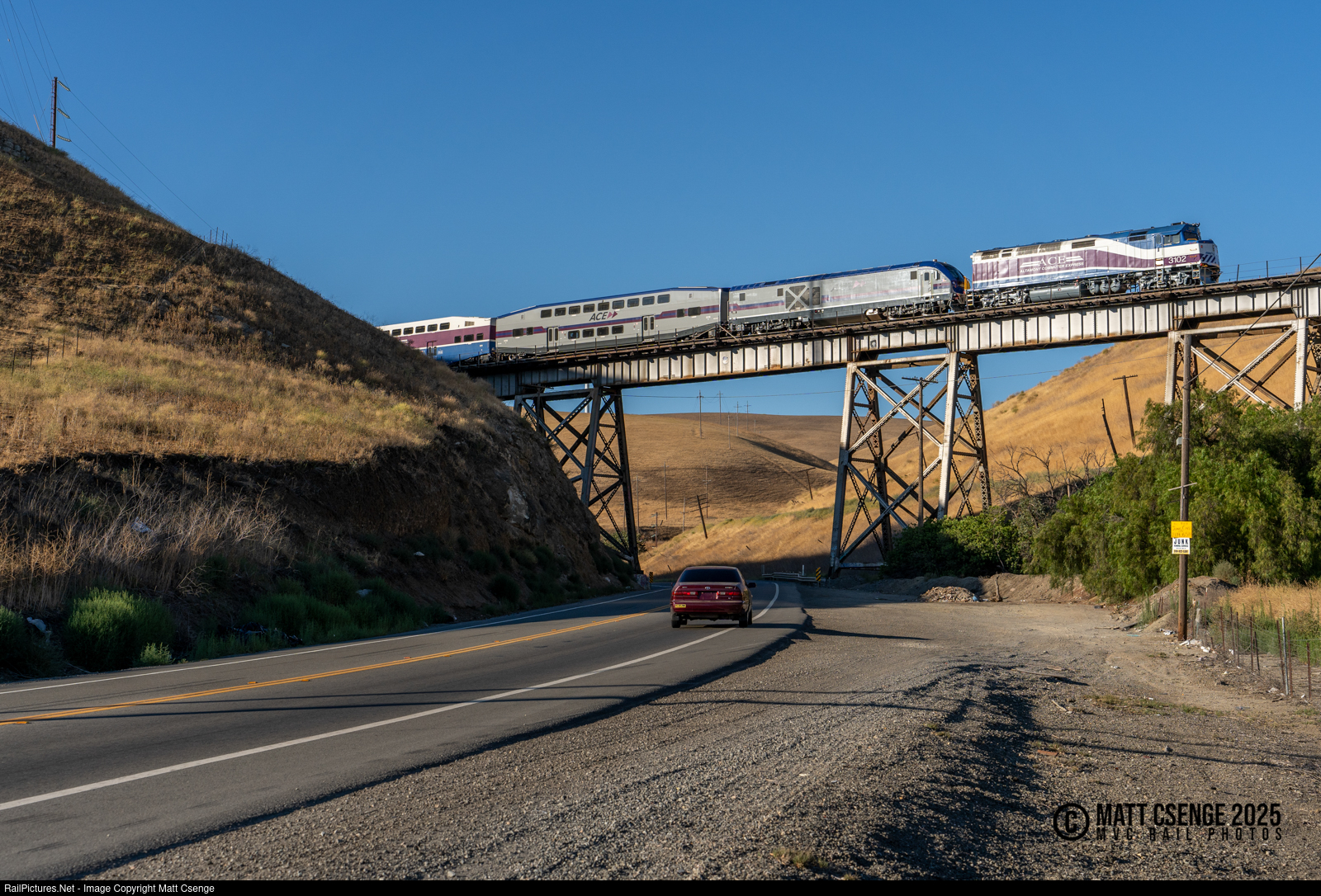 Different Double. Altamont Corridor Express (ACE) F40PH no. 3102 and SC-44 Charger no. 3110 are seen shoving train 08 across the high trestle over Altamont Pass Road.