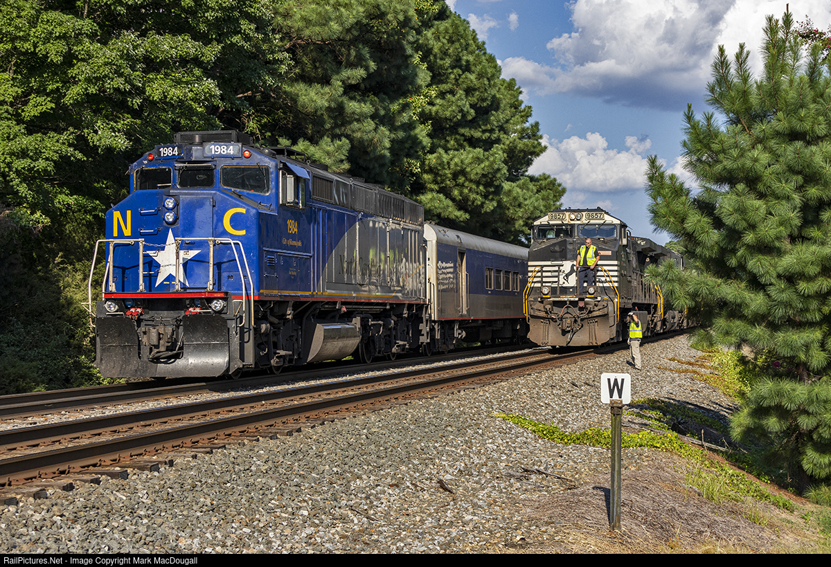 An NCDOT F59 brings up the rear of Amtrak 74 as the crew of NS empty grain train 51E observes their passage.
