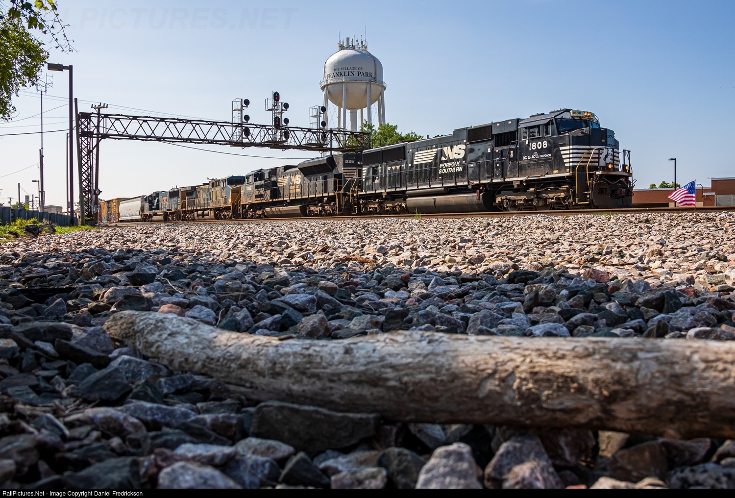 | NS 1808 (SD70ACC) leads CPKC I45 eastbound through Franklin Park, IL, after the conclusion of the Franklin Park Railroad Days locomotive display. |