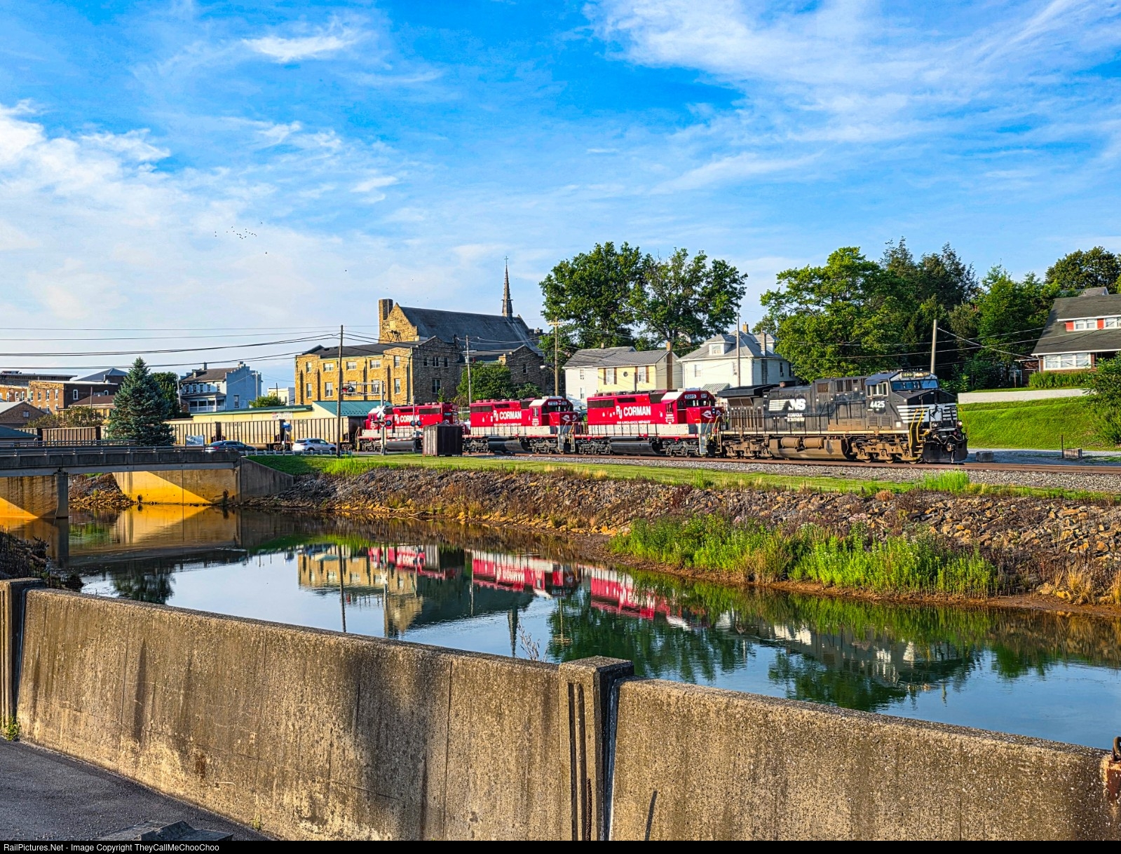 | A solo thoroughbred leads a trio of former Burlington Northern units on an empty coal train bound for Leslie Coal Company in Oseola Mills, PA. The Moshannon Creek is a little more calm giving a nice reflection the locomotives and the Trinity United Methodist Church. |