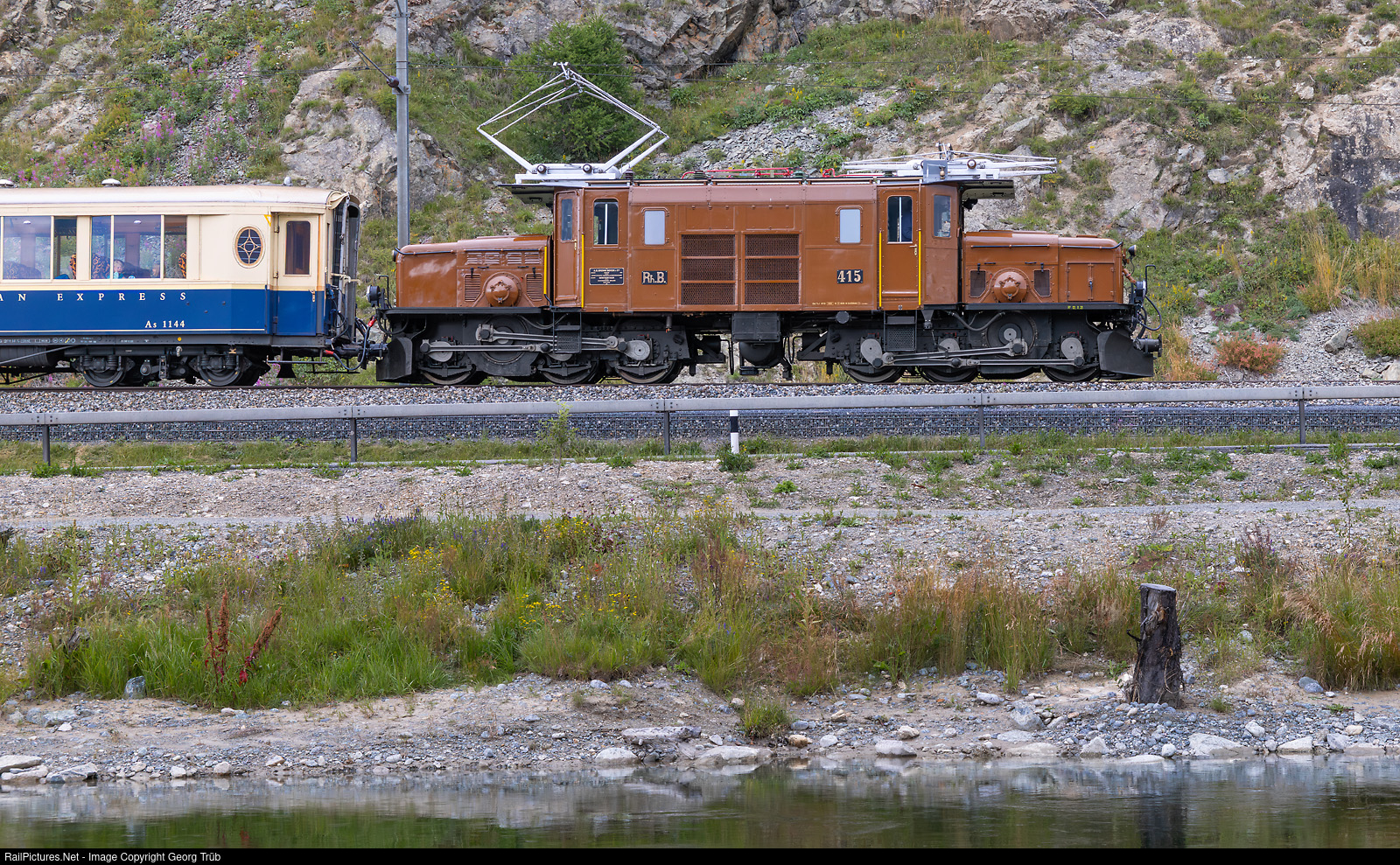 The "Rhaetian Crocodile" Ge 6/6 I # 415 of the Rhaetian Railway, built in 1929, pulls the adventure train "Luxury and Style" with the ALPINE CLASSIC PULLMAN EXPRESS parlor cars As # 1144, piano/bar car WR-S # 3820 and parlor As # 1143 along the young Inn river between Celerina and Samedan. Extra train 2132 circulates from St.Moritz via Filisur to Davos Platz and back this day, which is Swiss national day.