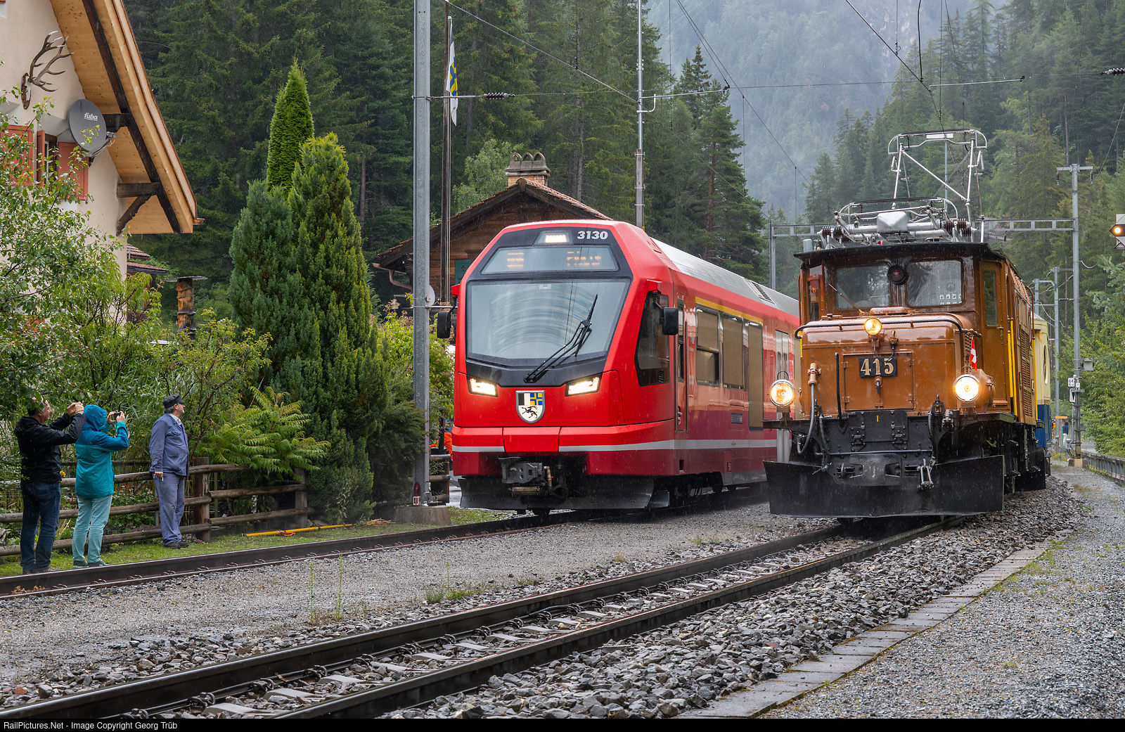 "Capricorn" train ABe 4/16 # 3130 of the Rhaetian Railway, running as regional train 7833 from Landquart via Davos to Filisur, is overtaking in Davos Wiesen the extra train 2131 from Davos Platz to St.Moritz with Ge 6/6 I # 415. Train 2131 is the adventure train "Luxury and Style" with the ALPINE CLASSIC PULLMAN EXPRESS cars As # 1143, # 1144 and piano/bar car WR-S # 3820.