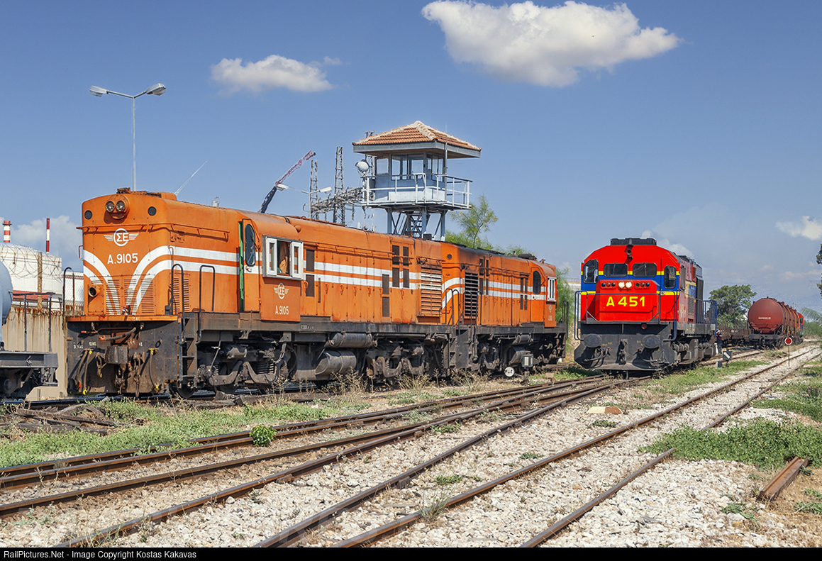 | An unusual encounter took place at the Aspropyrgos refineries when the ALCO locomotives from the metric gauge network of the Peloponnese met the standard gauge MLW A451. |