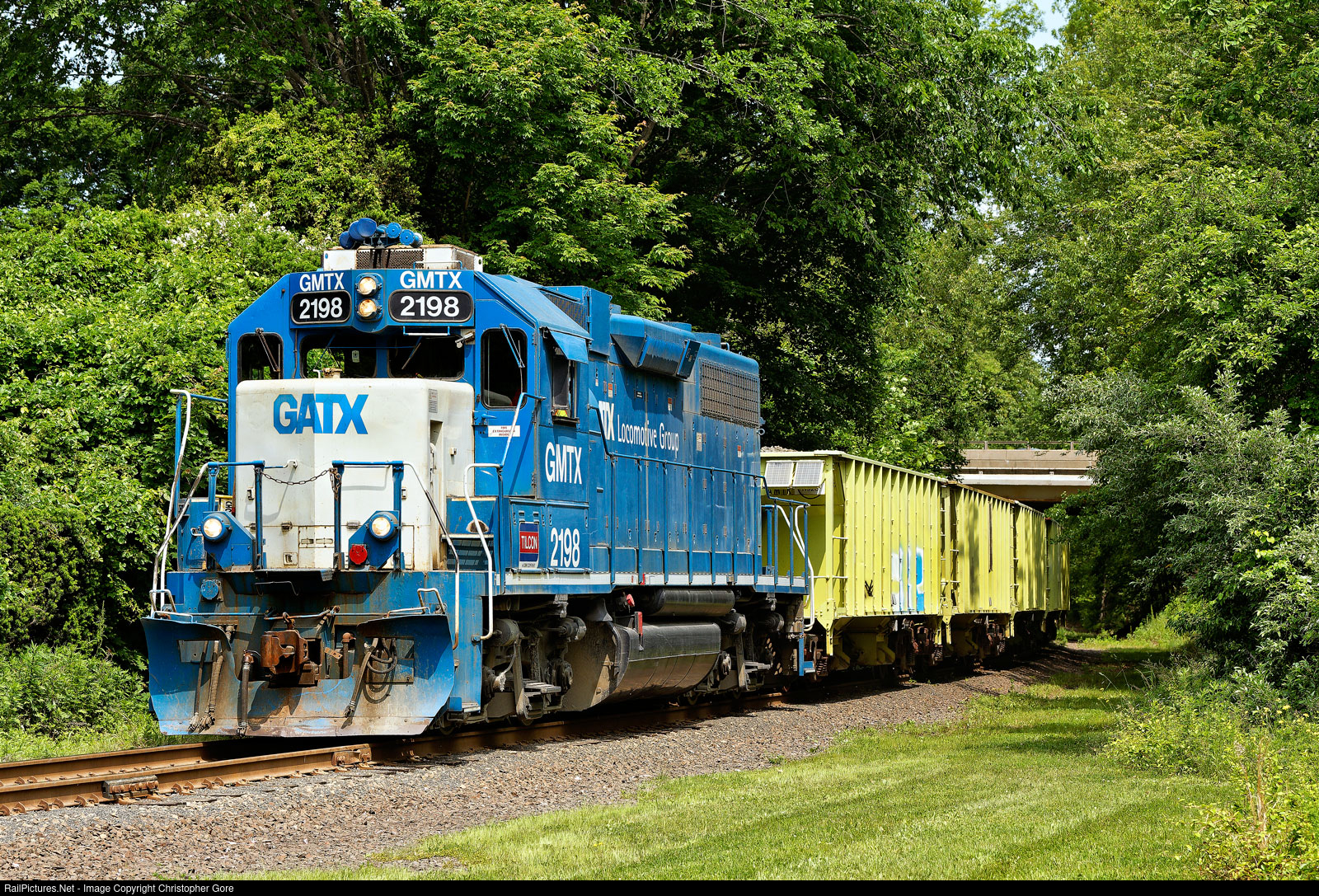 Branford Steam Railroad with loaded Amtrak ballast hoppers being led my leased GMTX GP38-2 2198.