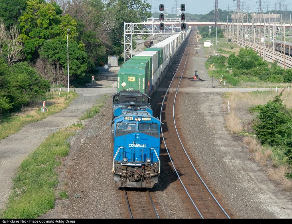 | NS 8098, the Conrail heritage unit, leads a intermodal West through Ogden Dunes. |