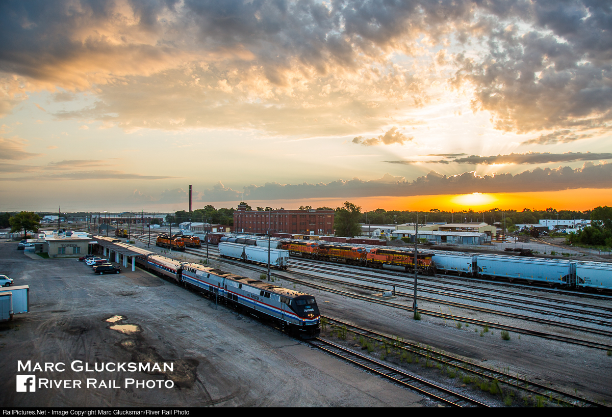 Good Morning Topeka. Running about 6 hours after the revenue train, the Southwest Chief Inspection Train arrived in Topeka, Kansas at sunrise on the morning of August 4, 2016. Led by the 40th Anniversary Phase III painted pair of AMTK 145 (P42DC) and 822 (P40DC), the train traveled from Kansas City, Missouri to Albuquerque, New Mexico to facilitate meetings with railroad executives, politicians, and interest groups that worked to create a coalition that funded upgrades to the line. In the background is the expansive BNSF Topeka Shop, which has been relocated in the past but has been serving as a major mechanical facility in this area for the railroad since the 1860s.