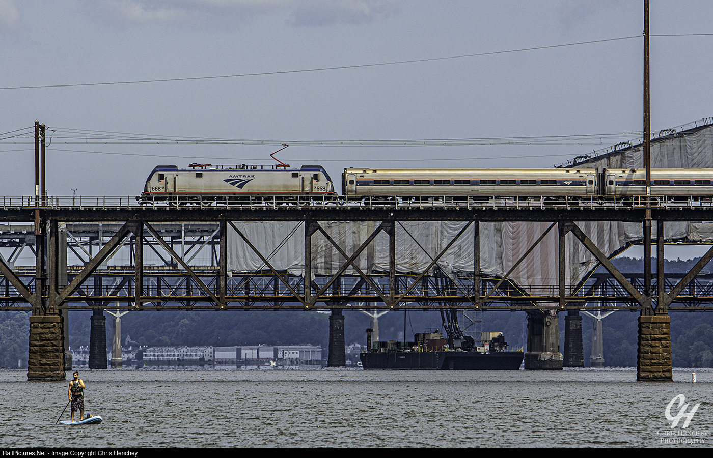 | A Regional train bound for Washington speeds over the Susquehanna River while a paddleboarder enjoys the glorious weather with low humidity on this August morning. |