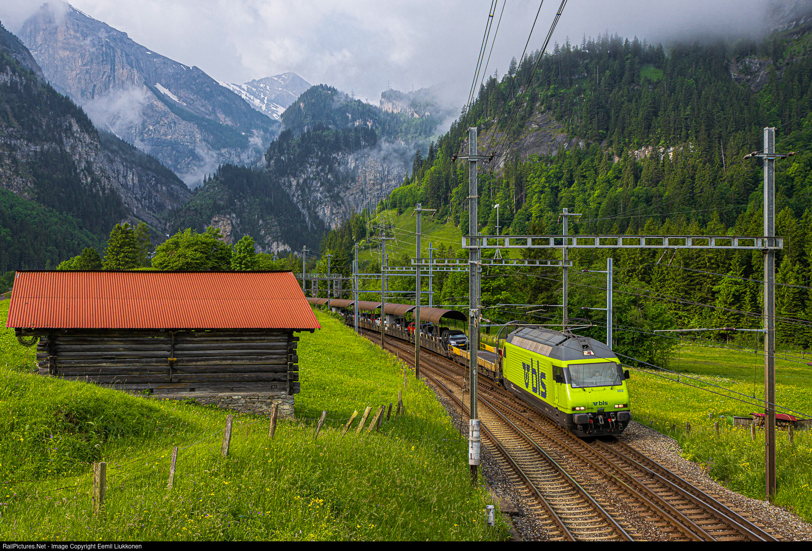 | Slowly curving and slowly breaking, the green class Re 465 electric locomotive of BLS is approaching Kandersteg. The locomotive is responsible for delivering car trains between Kandersteg and Goppenstein which itself as a route is unique due to its landscapes and purposes. |