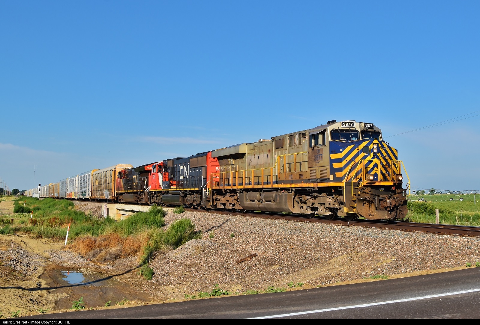 | Canadian National #3977 (former CitiRail ES44AC) leads a long freight through Hillrose, Colorado on its way to Sterling.