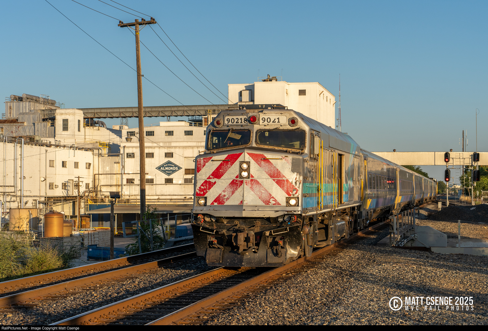 Caltrans Cab Car Conversion. Amtrak Non-Powered Control Unit (NPCU) 90218 is seen leading San Joaquin train 702(10) out of Sacramento, passing the Blue Diamond Growers plant on the north side of the city. The cab unit is a converted F40PH locomotive, modified into a cab car with the removal of the prime mover, traction motors, and main alternators. The conversion process also involved adding a roll-up door so that the former engine compartment could be used for baggage, leading to these cab/baggage cars being colloquially known as "cabbages." This unit is one of three sporting a Caltrans paint scheme, on long-term assignment to the state-sponsored Amtrak California operations.