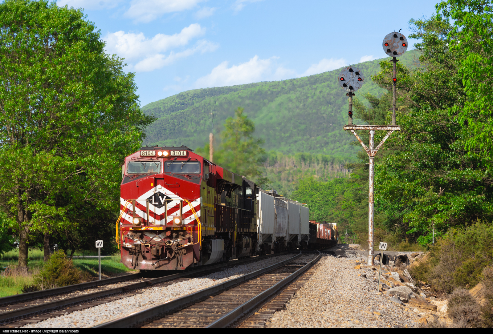 Solitude lies in the foothhills of the Blue Ridge mountains. Just above the quaint, rural town of Vesuvius, Virginia, the stillness of the air is shattered by Norfolk Southern 15T flying down Lofton Mountain Grade. Wrapping around the horseshoe curve between Pkin, and Lofton, the horn of 8104 echoes off the surrounding hills as the train barrels towards the north end of the double track. Flying through the equilateral switch at Pkin, NS 8104, the "Lehigh Valley" heritage unit, splits the N&W CPL's controlling the north end of 4 miles of double track. It's a straight shot from here, for the next 80 odd miles to Roanoke, Virginia.