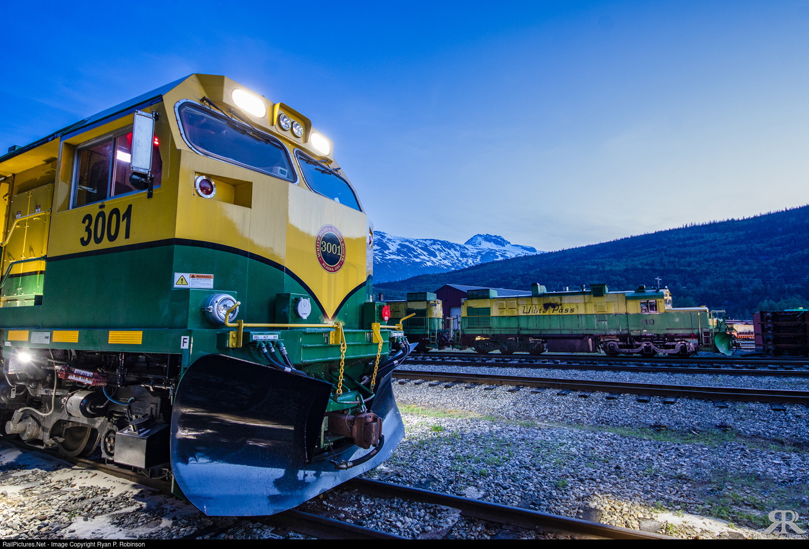 | The clock strikes midnight on the summer solstice in the land of the midnight sun. While still rather dark, there is enough light to move about without a flashlight to capture locomotives idling away at the WPYR shops. |