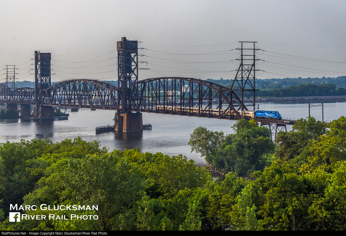 Can Opener On The Delair. NJ Transit's Conrail Unit On The Atlantic City Line. New Jersey Transit's Conrail Heritage Unit, GP40PH-2B NJTR 4208 (ex-CR 3191, née-Penn Central 3191, EMD, GP40, 10/1968) operated on the Atlantic City Line on Tuesday, August 5, 2025. Passenger service on this line was operated by Conrail under contract to the State of New Jersey, but used Budd RDCs. Conrail also operated freight on this line during its time as a Class I railroad, and continues to run on adjacent track and share the Delair Bridge with NJ Transit, so its appearance is a nominal return to its once home rails. Like all NJT diesels, its assignment to the line is temporary, so if you have the chance, get out and see it while it is still there. The train is seen crossing the Delaware River over the Delair Bridge to Philadelphia, Pennsylvania.