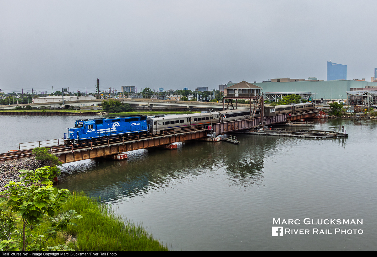 Blue Gamblers' Express. NJ Transit's Conrail Unit On The Atlantic City Line. New Jersey Transit's Conrail Heritage Unit, GP40PH-2B NJTR 4208 (ex-CR 3191, née-Penn Central 3191, EMD, GP40, 10/1968) operated on the Atlantic City Line on Tuesday, August 5, 2025. Passenger service on this line was operated by Conrail under contract to the State of New Jersey, but used Budd RDCs. Conrail also operated freight on this line during its time as a Class I railroad, and continues to run on adjacent track and share the Delair Bridge with NJ Transit, so its appearance is a nominal return to its once home rails. Like all NJT diesels, its assignment to the line is temporary, so if you have the chance, get out and see it while it is still there. The train is seen departing the Atlantic City, New Jersey Station. The "Gamblers' Express" as a name give to this service by Amtrak, which operated here from 1989-1995.
