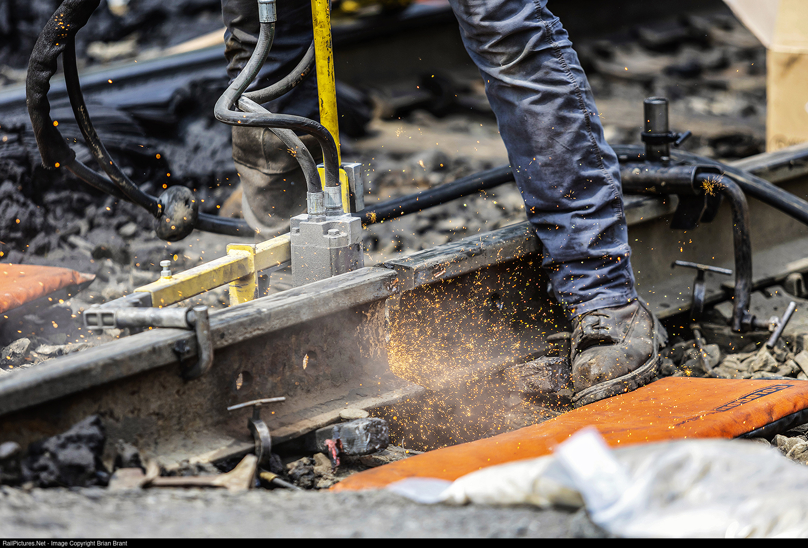 Sparks fly as a worker grinds the end of a section of rail that was cut out before being replaced.