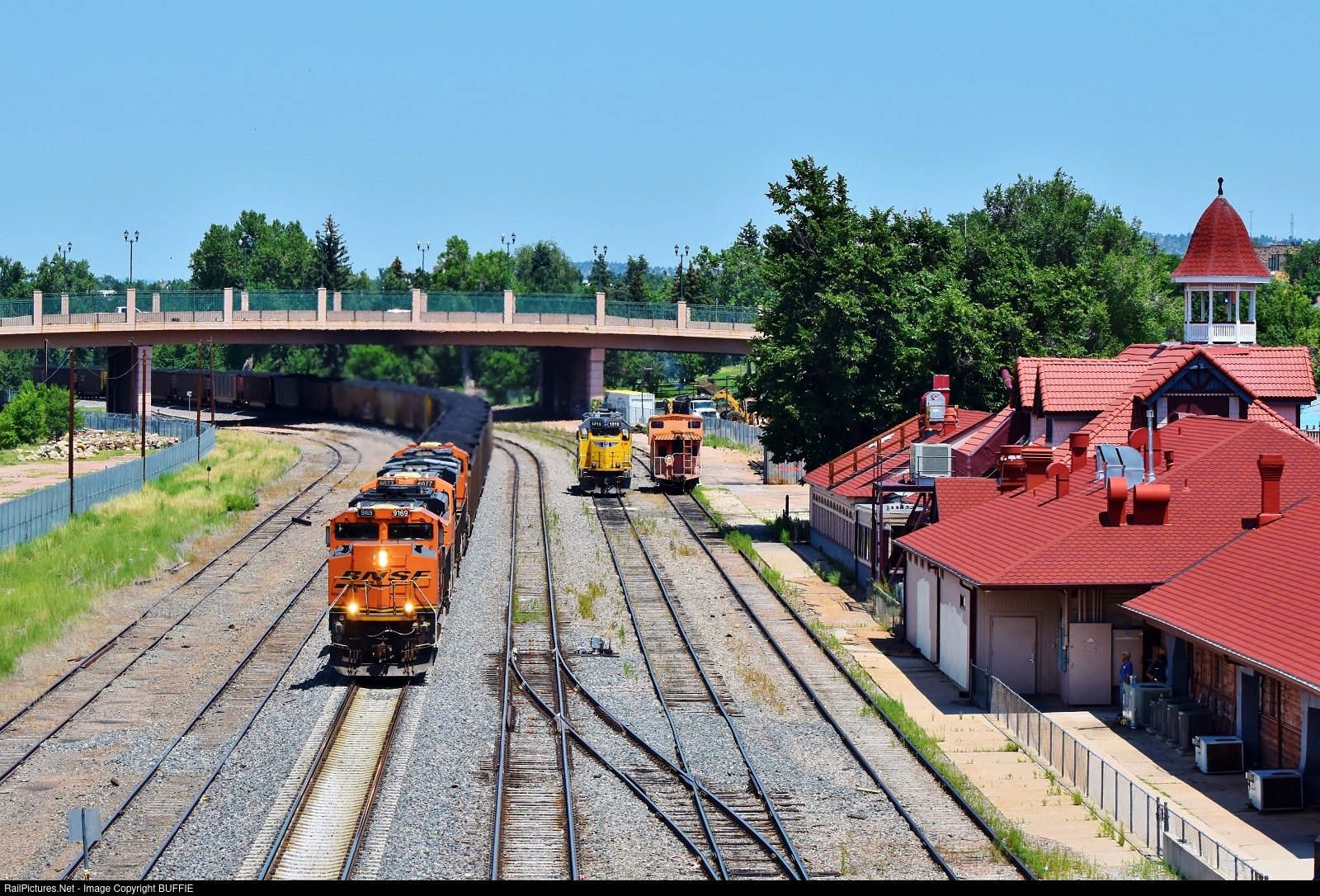 BNSF 9169 (SD70ACe) leads a coal train past the historic depot in downtown Colorado Springs.