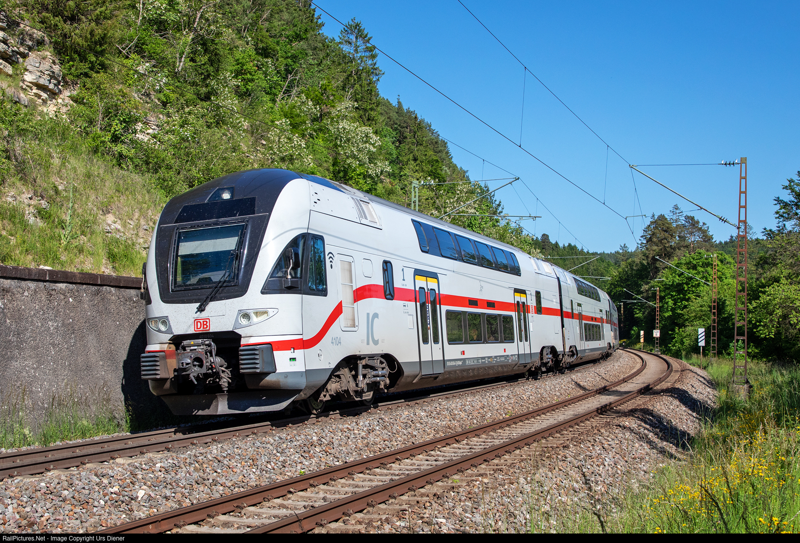 | With a delay of approximately 25 minutes, the six-car doubledeck intercity trainset 4010 104/604 of DB AG is on the way as train IC 484 from Zurich HB (Switzerland) to Stuttgart Hbf. |