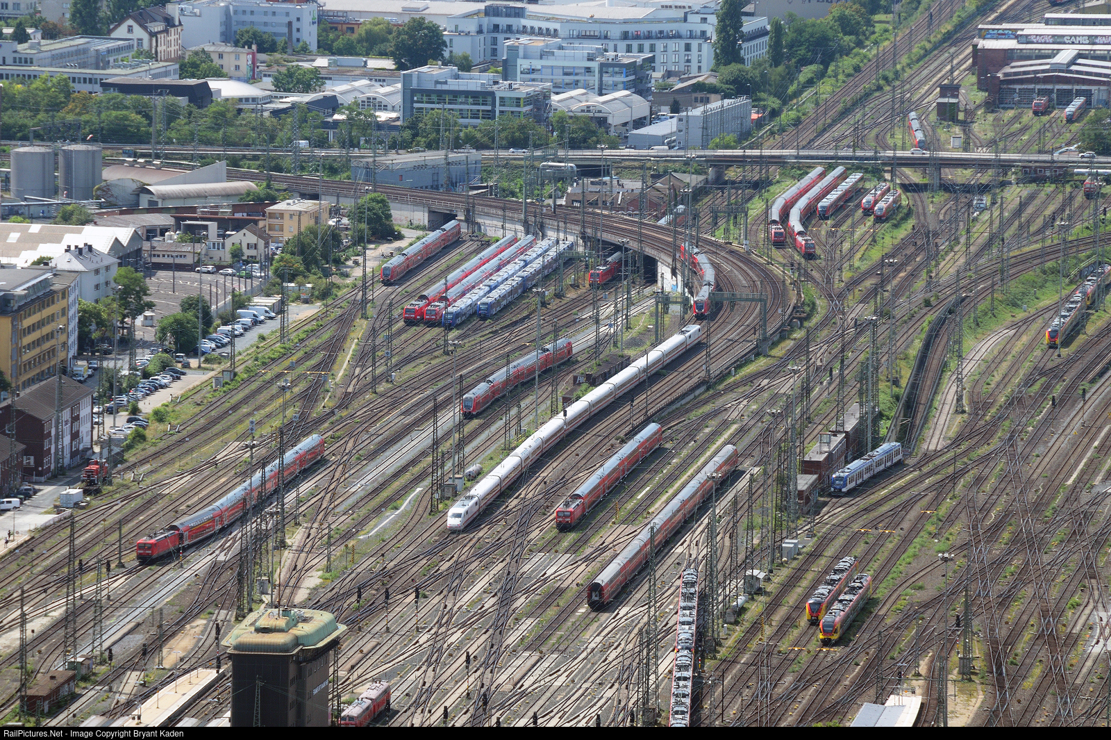 Arrivals and departures are nearly constant at Frankfurt (Main) Hauptbahnhof. Serving nearly 180 million passengers annually, it is the second busiest train station in Germany and third busiest in Europe, behind only Hamburg Hauptbahnhof and Paris Gare du Nord. Viewed from the observation deck of Main Tower, five of the trains visible in this shot were moving at the time.