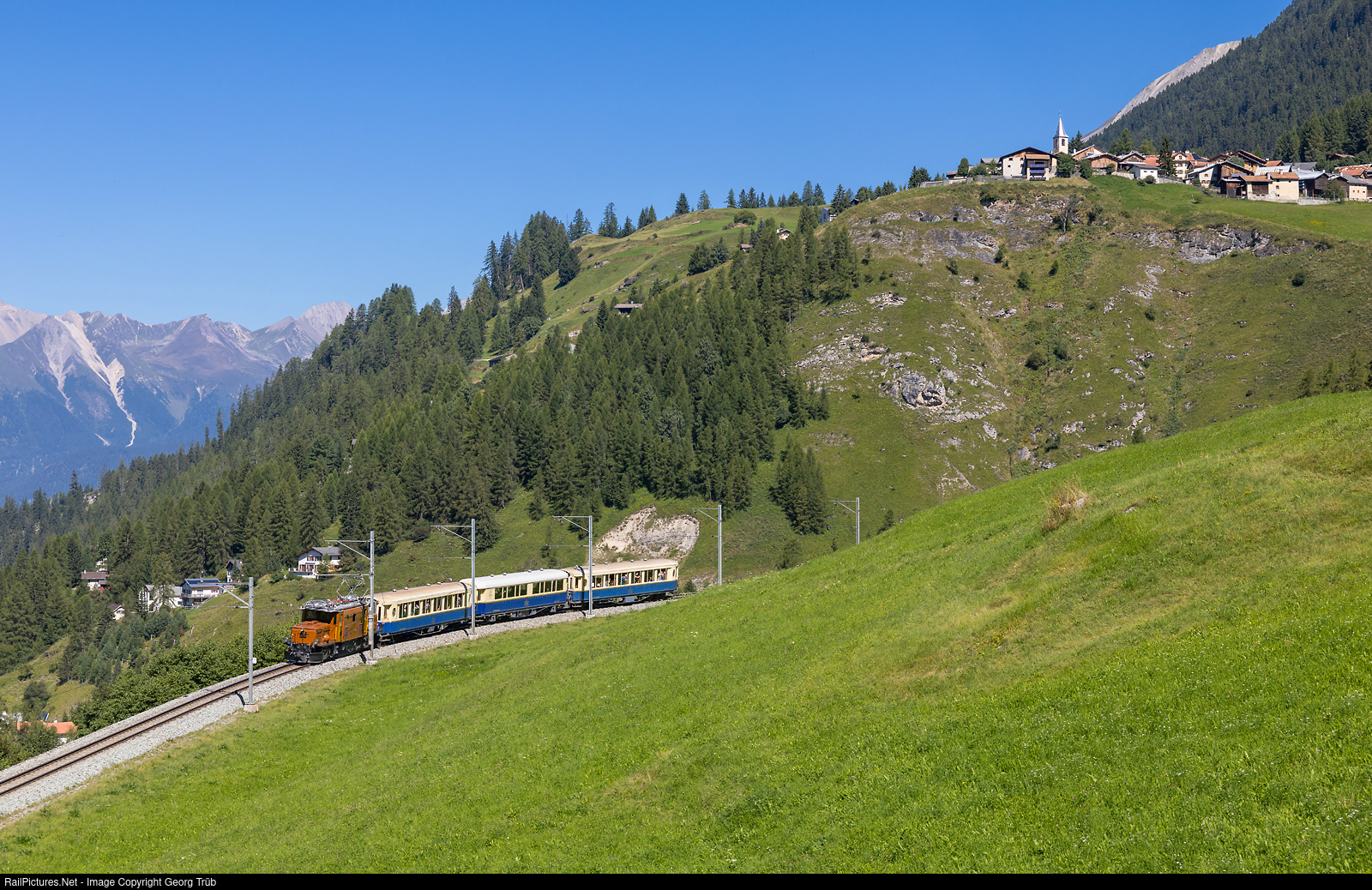 | Ge 6/6 I # 415 of the Rhaetian Railway, built in 1929, pulls the adventure train "Luxury and Style" from St.Moritz via Filisur to Davos Platz, between Muot and Bergün, with the village of Latsch on the valley side. |