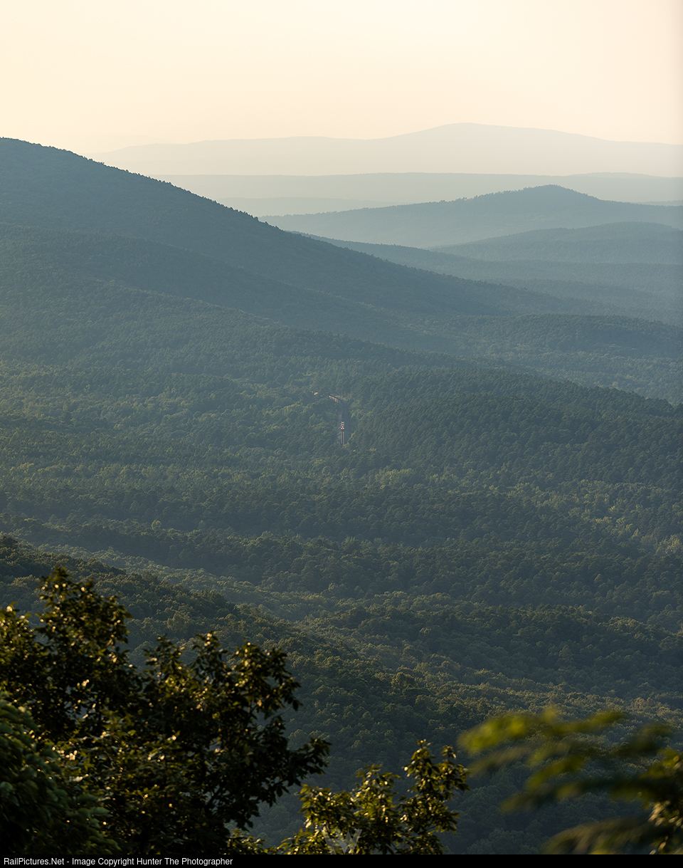 | Late in the day on a hot Saturday, August 9, 2025, a southbound train of coal loads descends the eastern slope of the Rich Mountain Grade near Eagleton, AR.