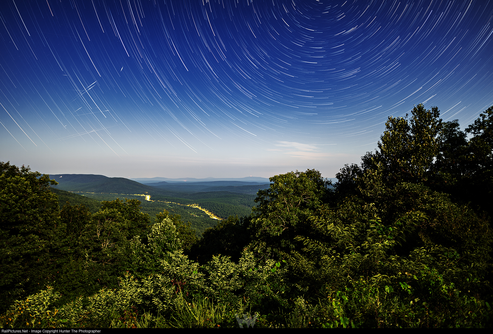 Moonlit Perseids | As Earth rotates for an hour beneath a mostly clear sky on the cool evening of Saturday, August 9, 2025, three northbound trains climb the eastern slope of the Rich Mountain Grade near Eagleton, AR. Several short streaks are visible on the left side of the image - meteors entering Earth's atmosphere as part of the annual Perseid Metoer Shower, which peaks about halfway through the summer season.