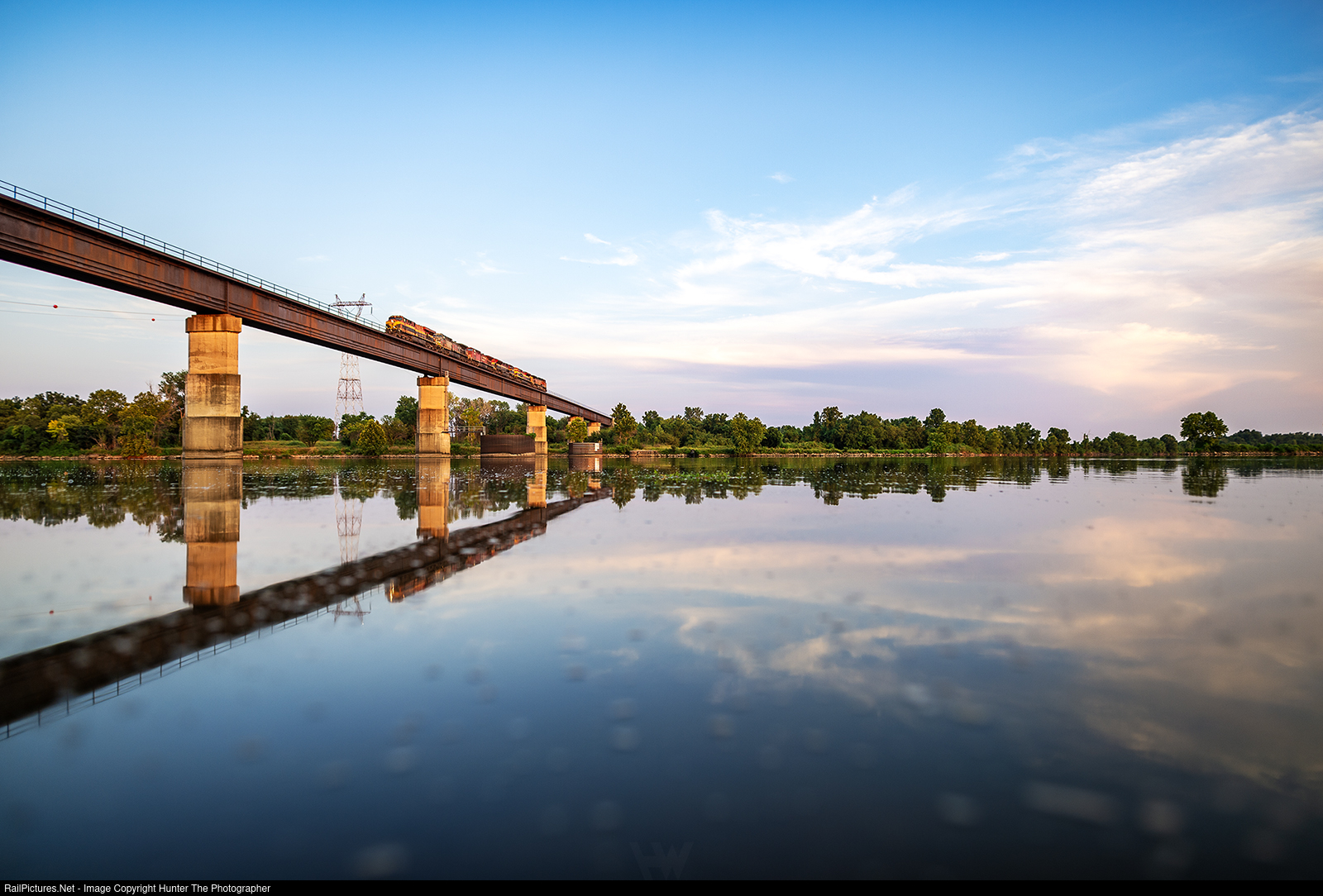 | Just before the sun drops below the horizon on a warm Sunday, August 10, 2025 evening, a northbound set of locomotives cruise across the Arkansas River just north of Spiro, OK.