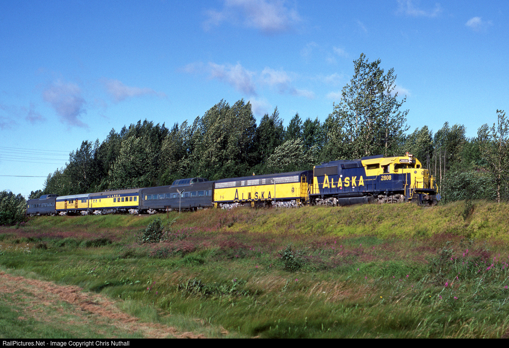 40 years ago, a Lawyers special from Anchorage to Wasilla runs through Elmendorf. Power was provided by ARR GP49 2808 along with power car P-6 (formerly UP E9B 963B/Amtrak 666), Included are two former D&RGW/RGZ dome cars, possibly Silver Mustang and Silver Pony.