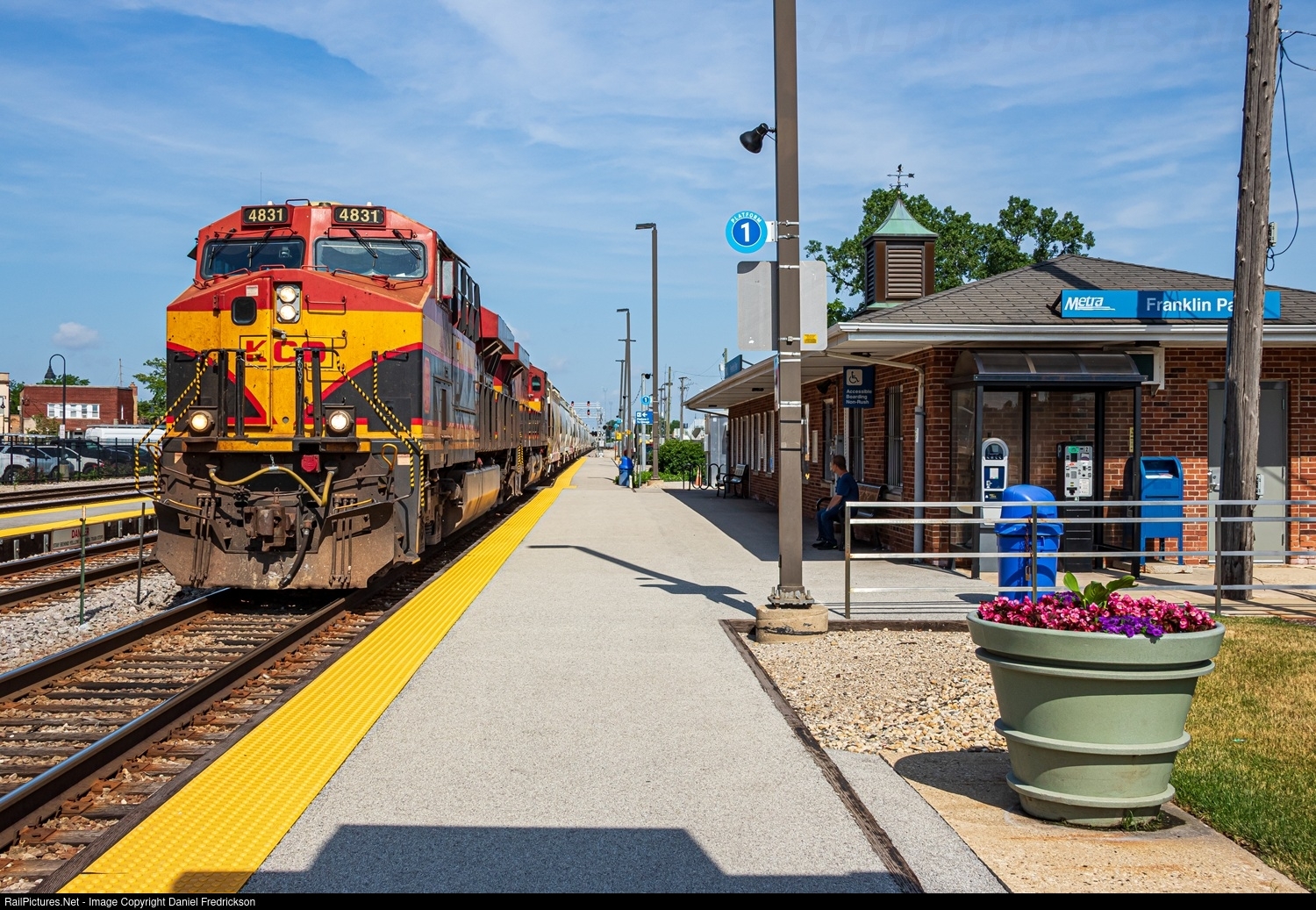 KCS 4831 (ES44AC) leads eastbound CPKC sand train 640 past the Metra depot in Franklin Park, IL.