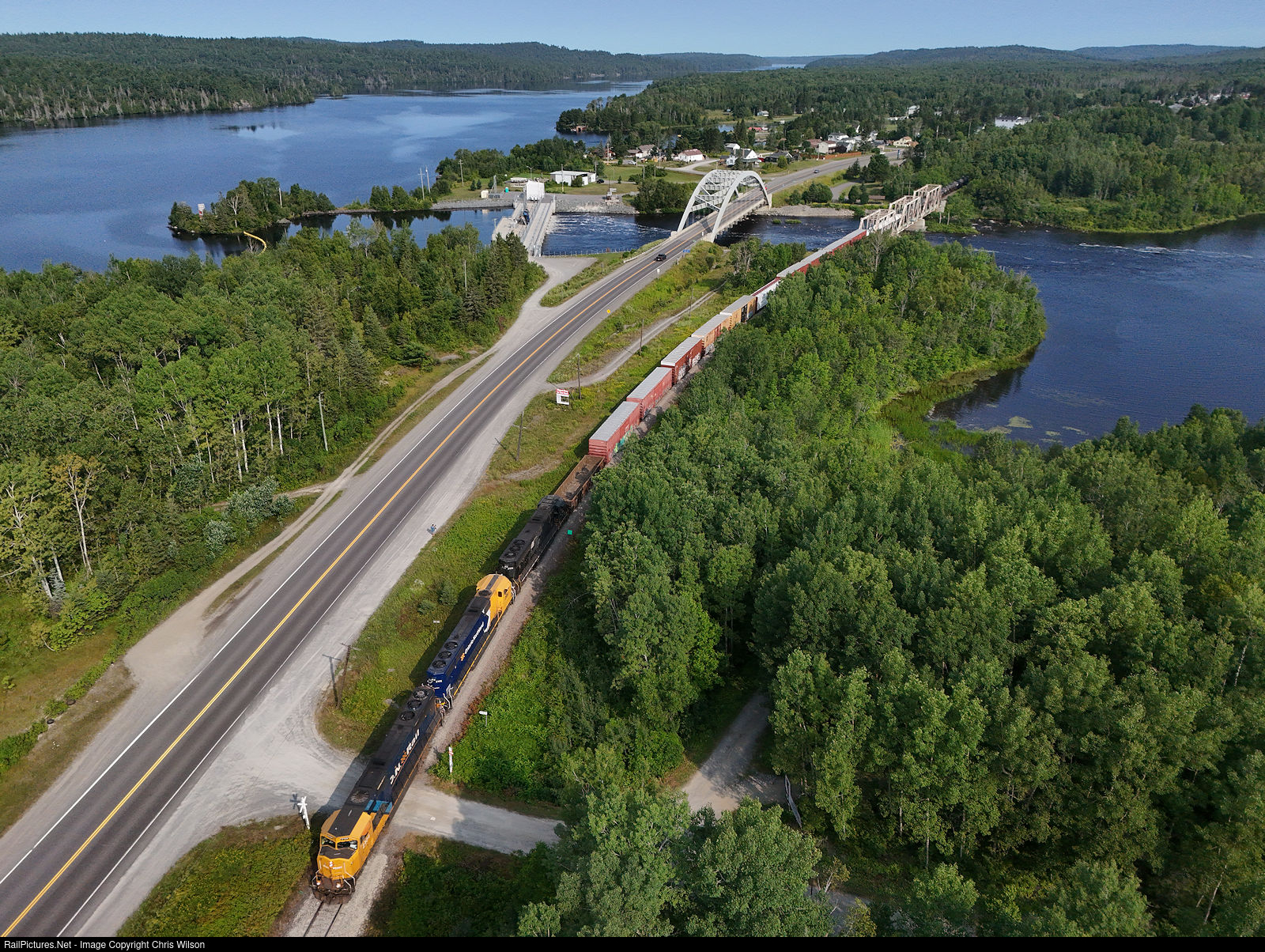 Englehart to North Bay freight train 214 heads south alongside the Trans Canada Highway #11 at the Montreal River in Latchford.