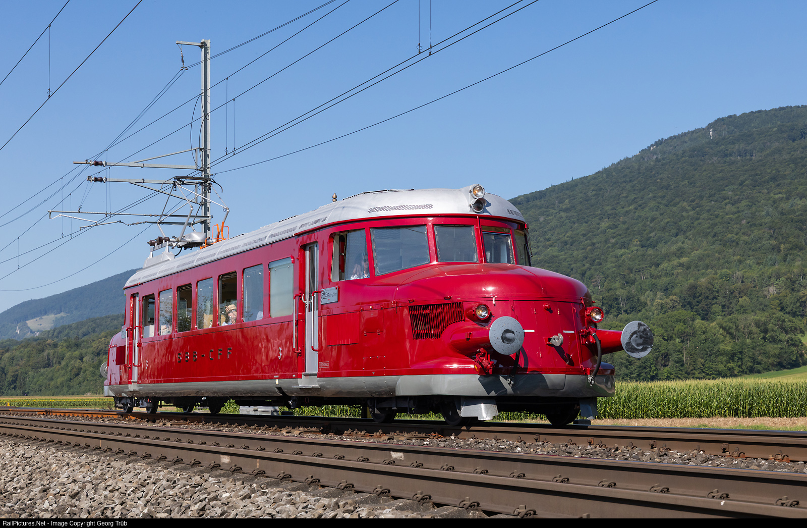 | "Red Arrow" RCe 2/4 # 607 of the Oensingen-Balsthal-Bahn is on a sunday round trip from Baslthal via Oensingen-Olten-Aarau-Suhr-Zofingen-Rothrist-Burgdorf-Solothurn-Oensingen back to Balsthal, between Oensingen and Oberbuchsiten. |