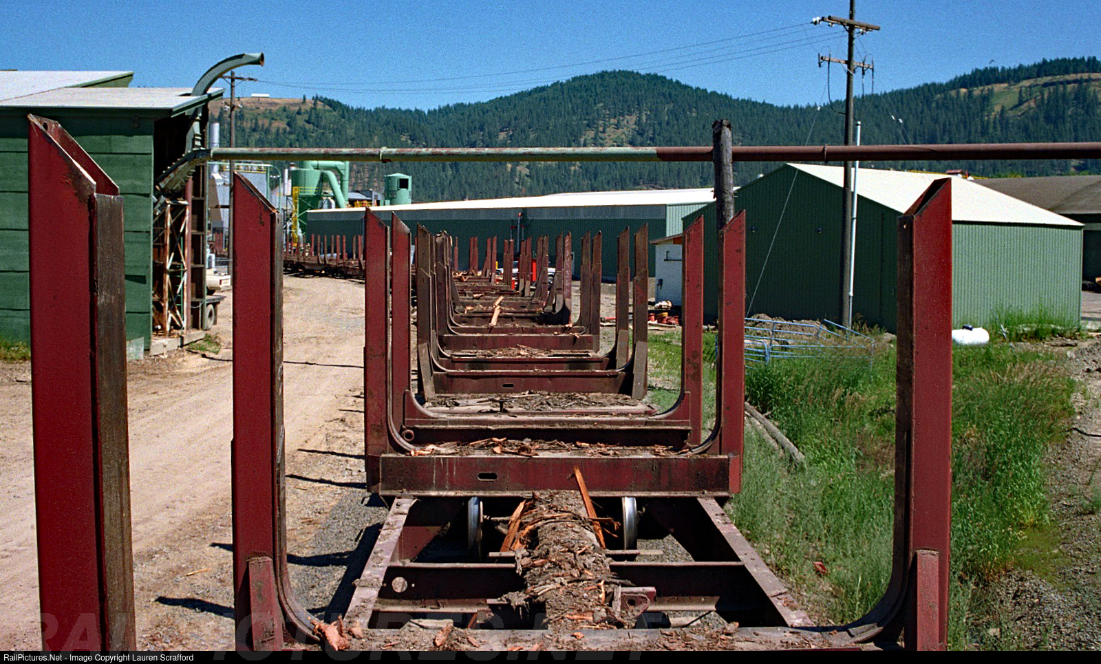 St. Maries River Railroad, STMA 101 pulling 25 empty log bunks out of the PFI mill in St. Maries on August 8, 1994. These log bunks will be spotted in the west yard to be hauled to Clarkia, ID for reloading. Homemade former Milwaukee Road log bunks.