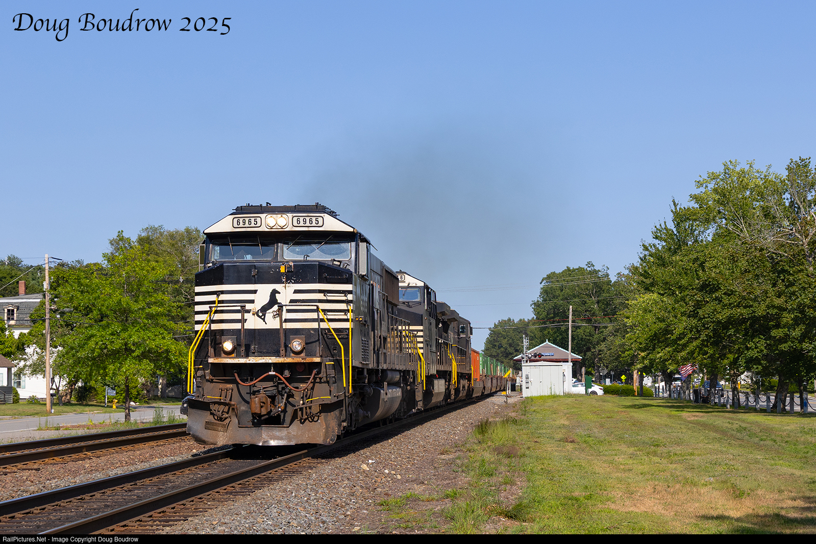 | After a later than usual departure, intermodal train B101 is accelerating though Shirley beginning its trip West. The days for this train are numbered as soon as bridge work is complete, it will be routed over CSX as a double stack train. |