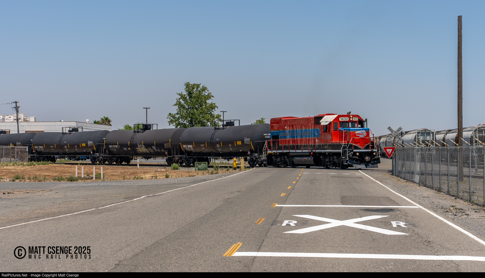 Sacramento Valley Railroad (SAV) GP15-1 no. 1433 is seen shoving a cut of tank cars through McClellan Park, a business park on the grounds of the former McClellan Air Force Base. |