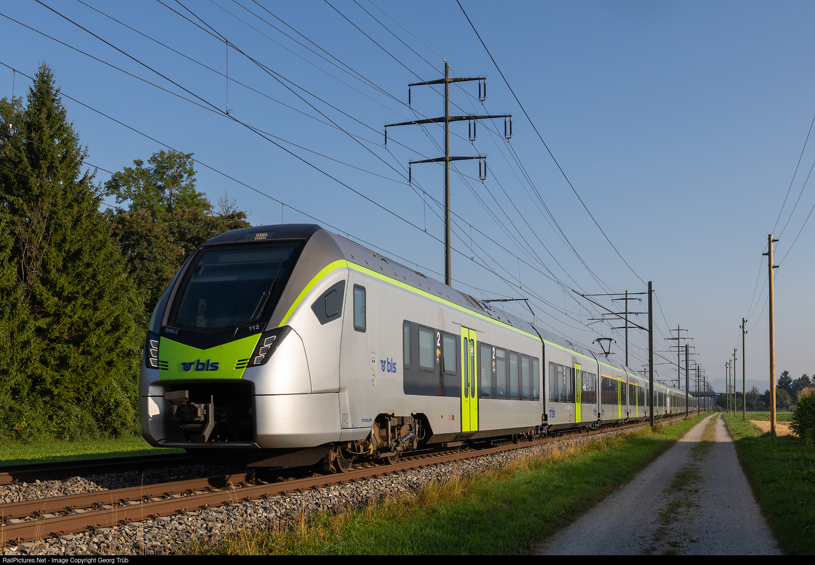 | Flirt MIKA of the BLS RABe 528 # 112 and # 121 of the BLS in multiple control are running the RE 4161 of the line RE1 from Bern to Domodossola/Italy and Zweisimmen, between Wichtrach and Kiesen. The train will be split in Spiez, first MIKA will go to Domodossola, second to Zweisimmen. |