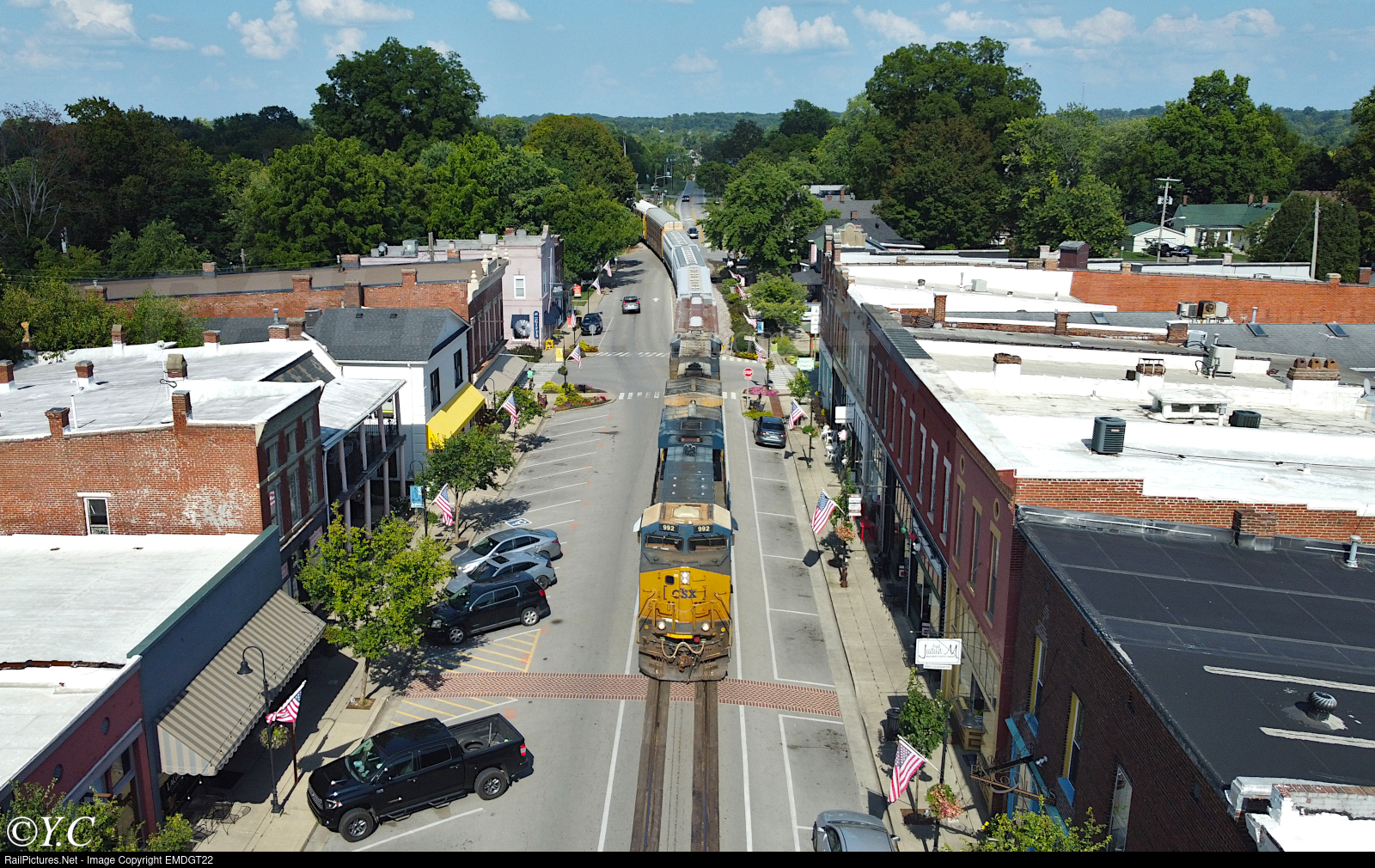 CSX M573 eases into the 10 MPH speed restriction through Main Street in downtown La Grange.