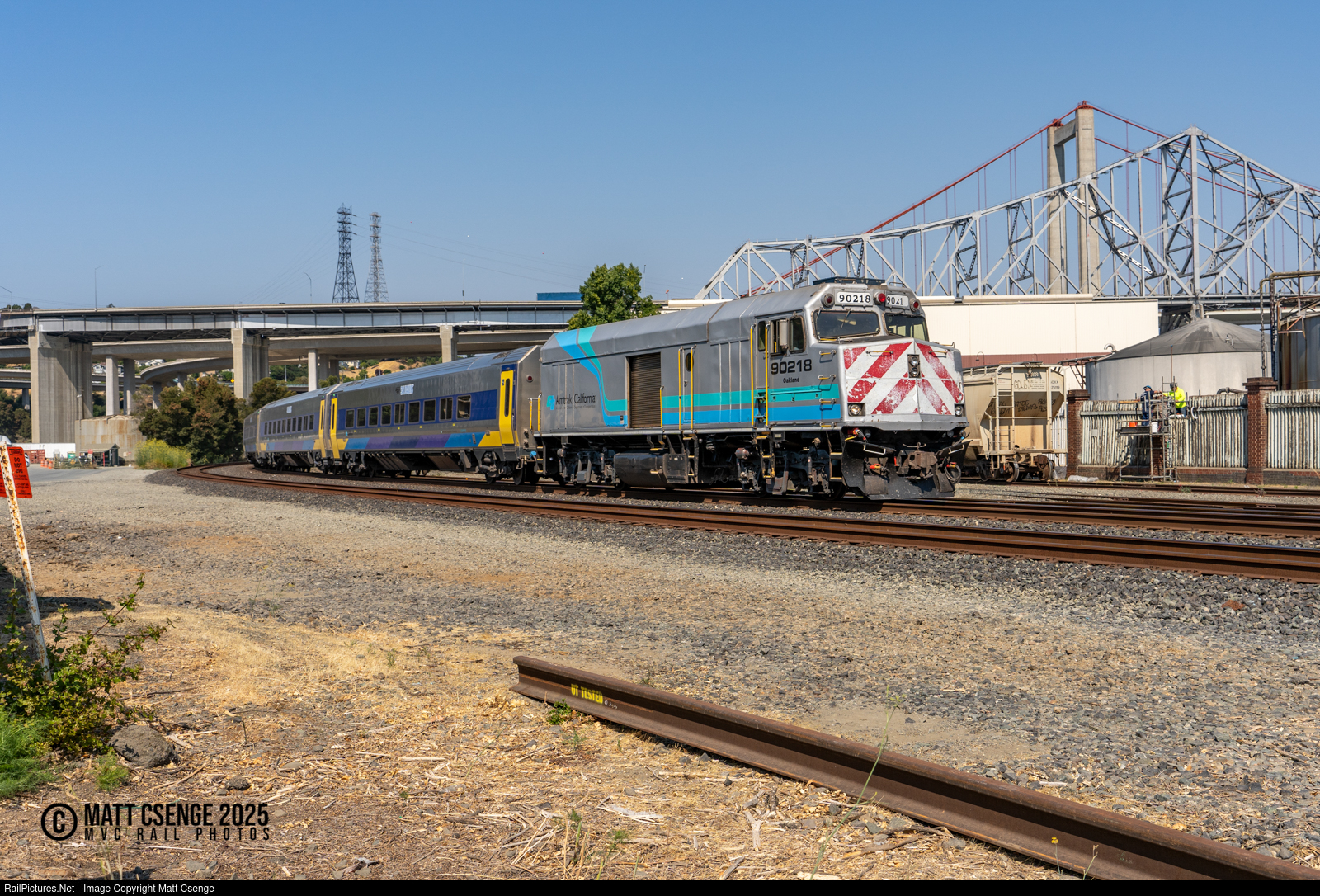 Amtrak F40 non-powered control unit (NPCU) 90218 is seen leading San Joaquin train 712 through Crockett, CA, passing the C & H Sugar plant. The unit is a former F40PH locomotive, converted to cab/baggage car (affectionately known as a "cabbage") and painted in Caltrans scheme. |