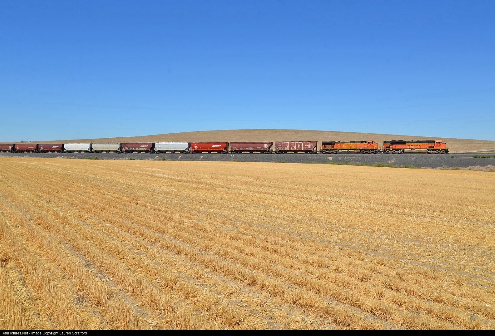 | BNSF 8997 E/B empty grain train about to crest the grade on the west side of Providence Hill, WA with BNSF 5081 and one rear DPU on August 10, 2025. The wheat fields in the surrounding area have been freshly cut. |