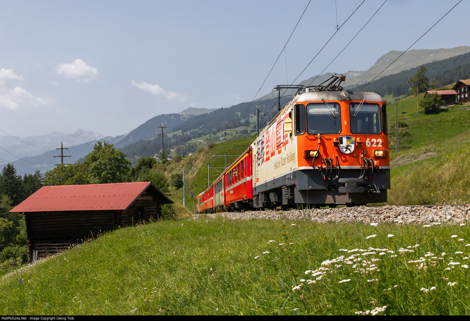 | Ge 4/4 II # 622 of the Rhaetian Railway in the "Hakone Tozan Railway" publicity paint scheme (japanese sister railway of the RhB) pulls the regional train 1441 from Chur to Arosa, between Peist and Langwies. |