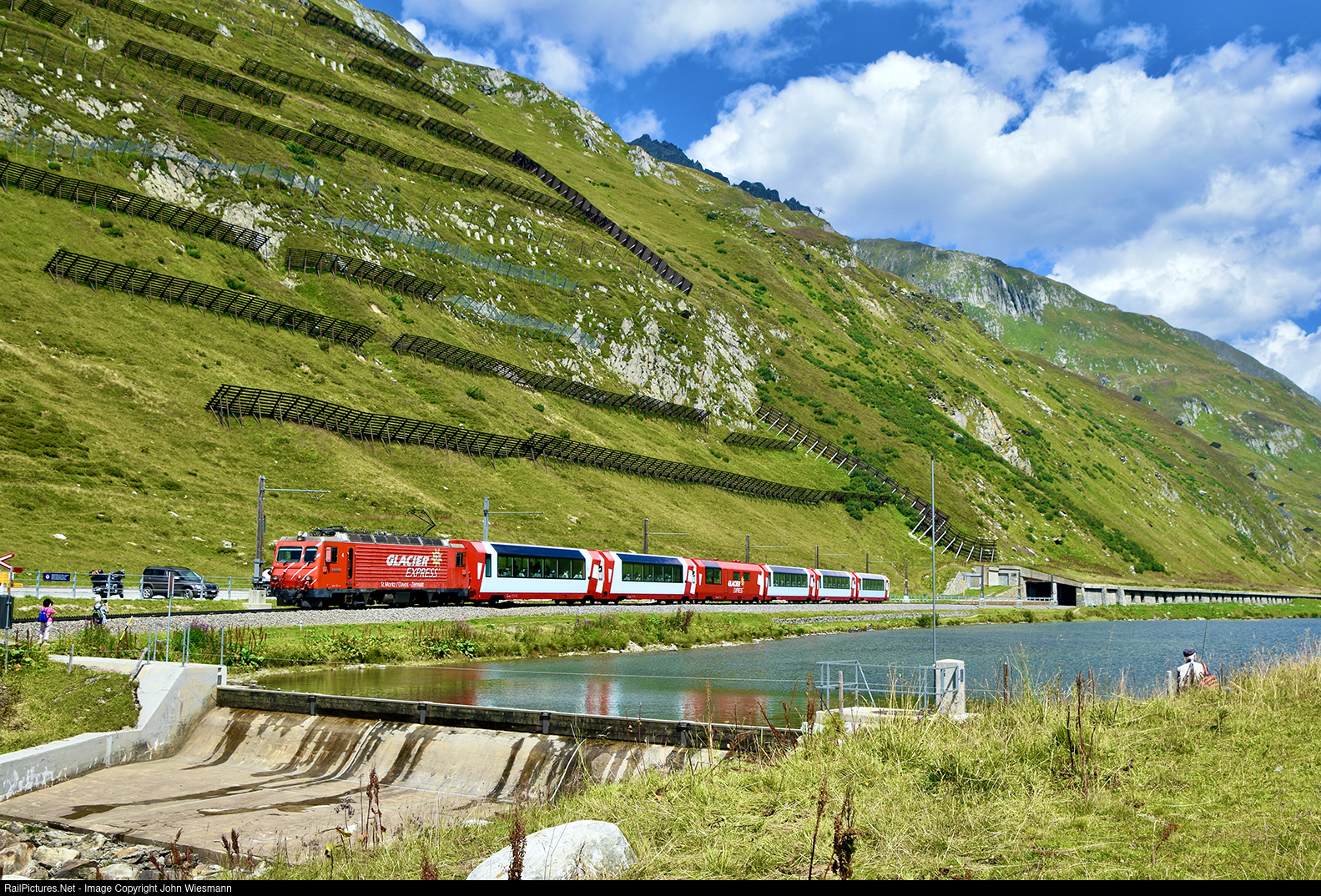 MGB with Glacierexpress passing the Lake of Oberalp, just changing to the Cog wheel system for the downgrade to Andermatt: Have a look at the avalanche control structures, necessary in