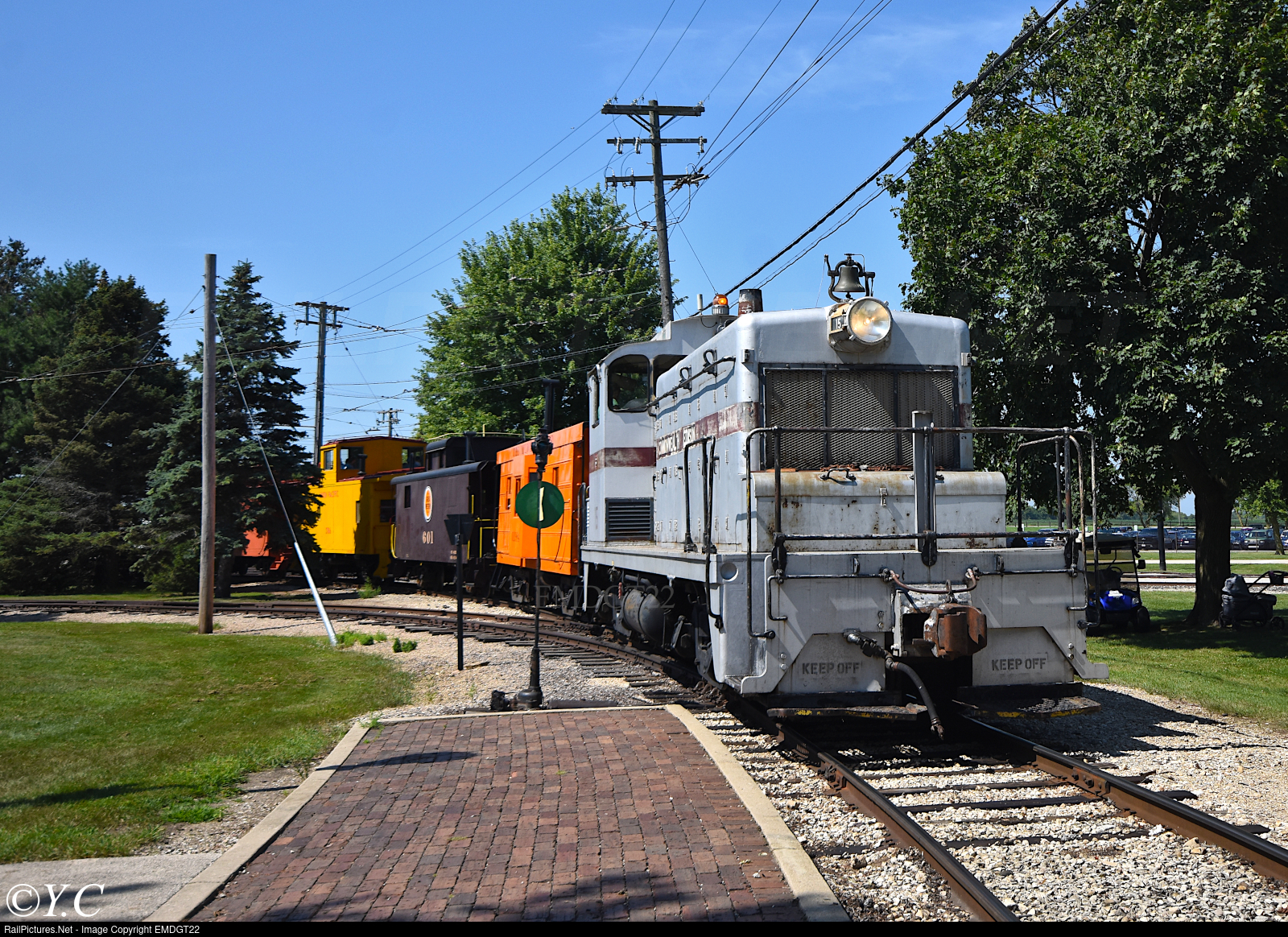 | Commonwealth Edison #15 prepares to lead the caboose train out of Depot Street. Built in 1950, this unit was assigned to Commonwealth Edison's nuclear power plant in Byron, IL. It arrived at the museum in 2001. |