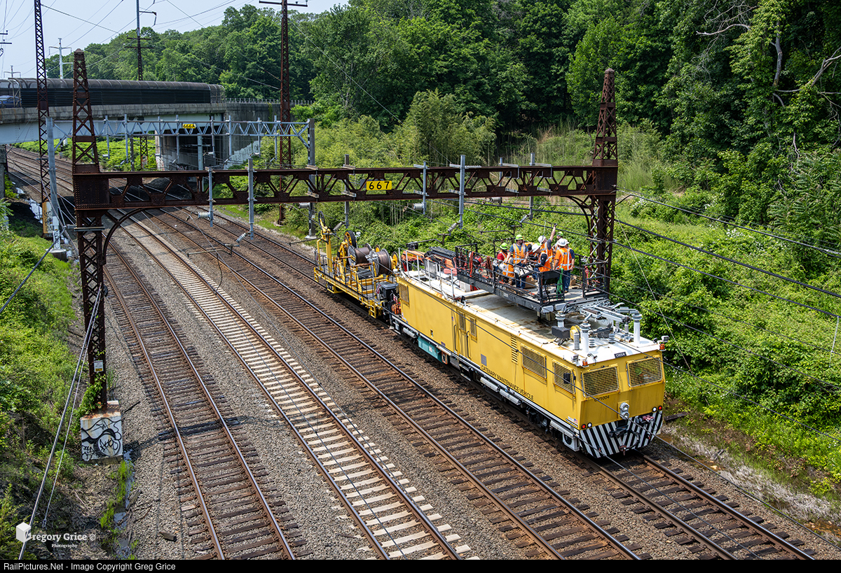 On the evening of June 6th, 2025, Metro-North Railroad Electric Traction employees aboard Plasser Catenary Maintenance Vehicle MNCW CV1004 work to repair damaged catenary between US Route 1 and Mill Hill Road on the New Haven Line in Southport, Connecticut. The damage, which occurred the previous evening between Southport and Fairfield stations after a series of events, disrupted service New Haven Line service in the area. Thanks to the Electric Traction team’s efforts, service was restored on most tracks by the following morning.