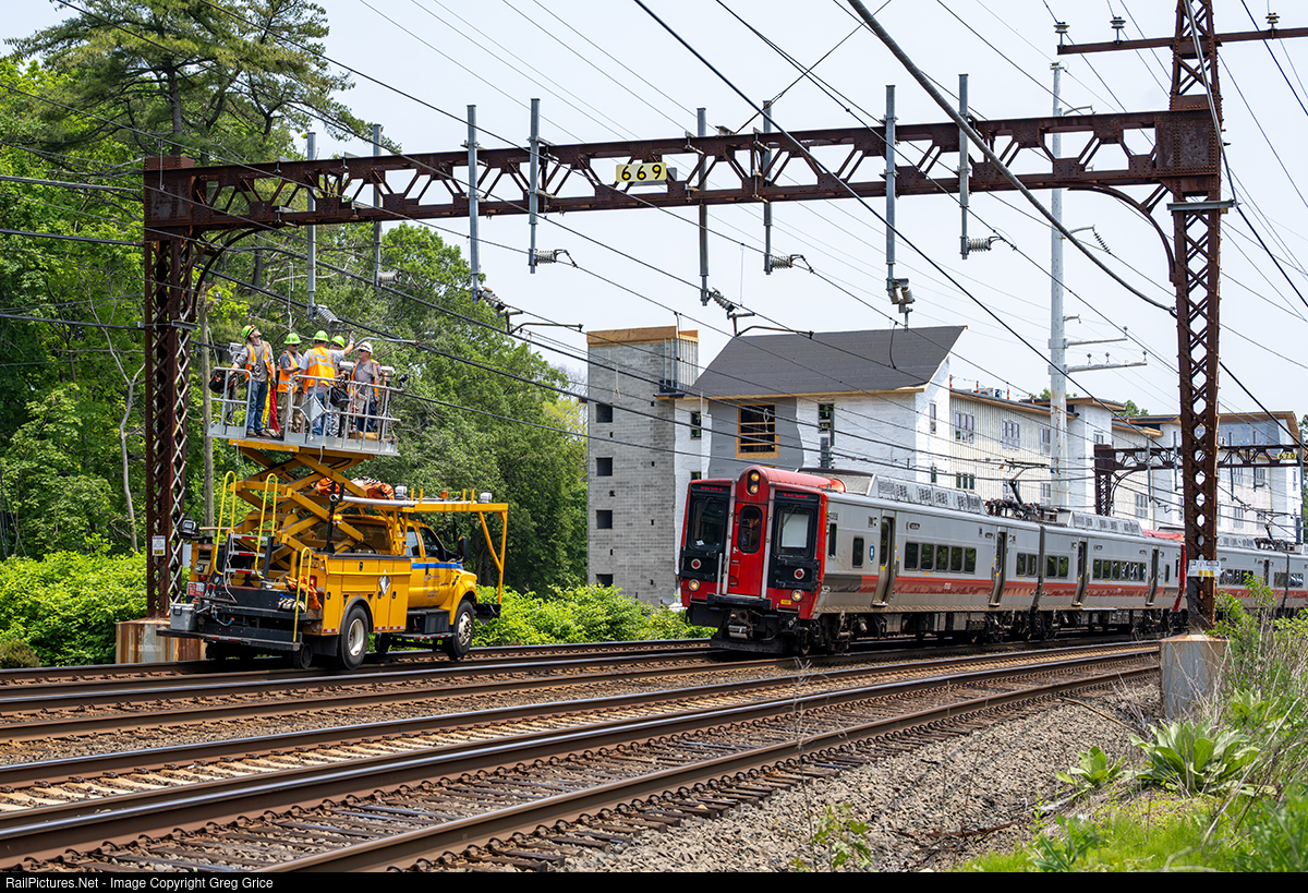 On the evening of June 6th, 2025, Metro-North Railroad Electric Traction employees aboard Ford Catenary Maintenance Truck MNCW TC1921M work to repair damaged catenary at catenary pole 669 on the New Haven Line in Southport, Connecticut. As they work, a Grand Central bound train passes on the adjacent track. The damage, which occurred the previous evening between Southport and Fairfield stations after a series of events, disrupted service New Haven Line service in the area. Thanks to the Electric Traction team’s efforts, service was restored on most tracks by the following morning.