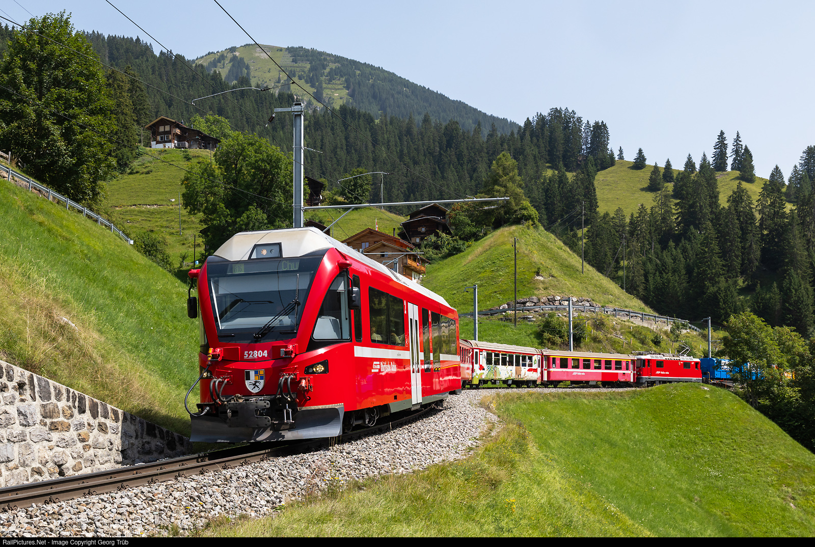 | Push-pull regional train 1440 of the Rhaetian Railway from Arosa to Chur, between Langwies and Peist, with leading cab car Bt # 52804 and Ge 4/4 II # 617 shoving in the rear. In the consist is a B type IV in the "Bärenland Arosa" publicity paint scheme. Behind the locomotive are two freight cars, which is typical for the Arosa line, a blue vaste container and a Coop retailer container on flat cars. |