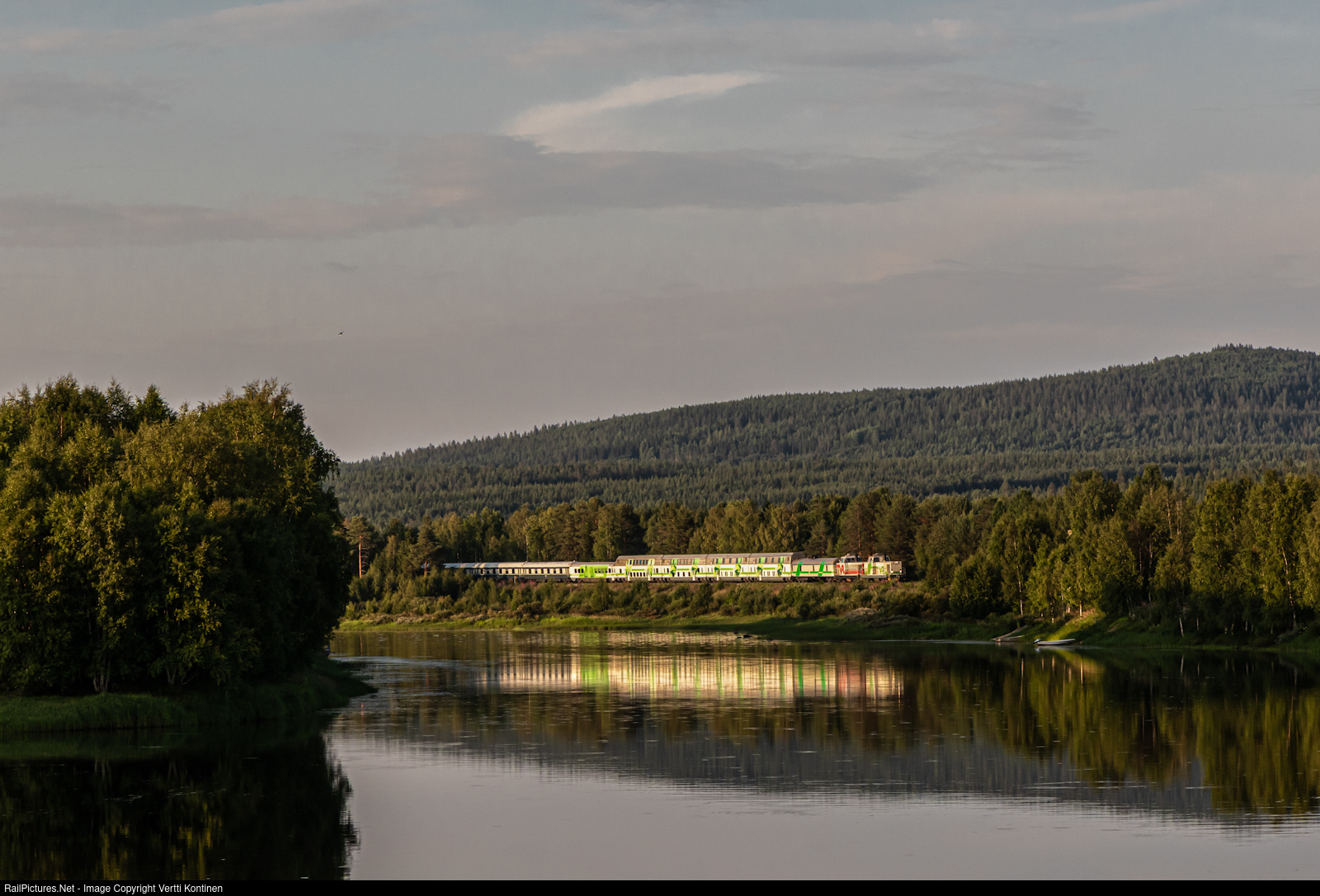| Overnight train PYO 276, hauled by Dr16 locomotives 2819 and 2818 running on the shores of Tornio river from Kolari to Helsinki. Tornio river also serves as the border between Sweden and Finland